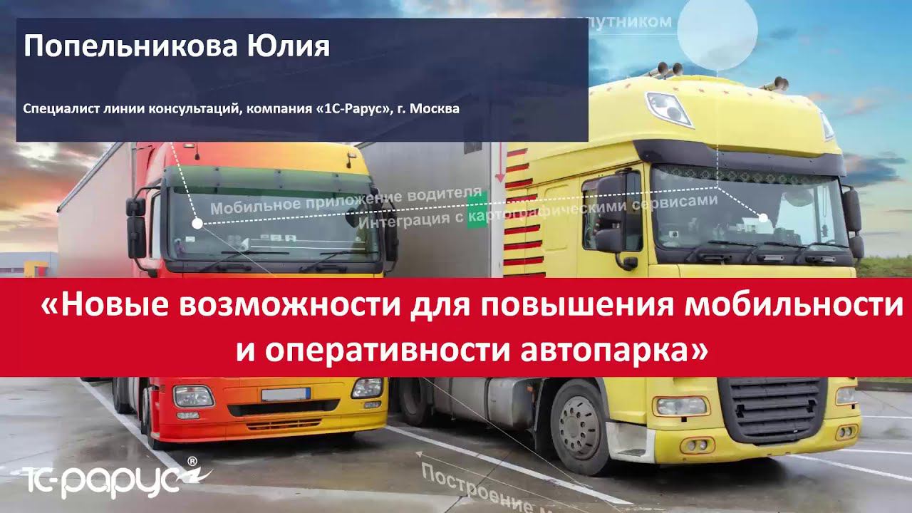 Запись вебинара от 15 октября 2020 года на тему "Новые возможности для повышения мобильности и оперативности автопарка". Программа вебинара: Работа с блоком «Мониторинг» в программе «Основные настройки». Загрузка данных из систем спутникового мониторинга. Использование обработки «Загрузка данных мониторинга из файла». Работа с электронными картами в программе. Терминал для самостоятельного приема и выдачи путевых листов. Возможности мобильного приложения водителя на Android: передача заказов из диспетчерской; контроль этапов выполнения заказов; передача сканов документов; работа с путевыми листами и заявками на ремонт; обмен сообщениями; навигация. Возможности АРМ Контроля перевозок.