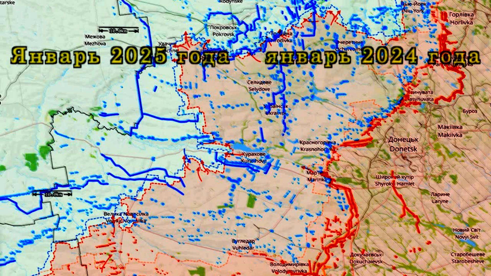 Карта боевых действий. Изменение линии фронта к западу от Донецка с январь 2024 по январь 2025 года