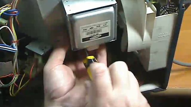 Печь Samsung. Неисправность у этой печи, как у большинства, это пробой диэлектрической прокладки вследствие того, что она напиталась жирными испарениями. Отгибаем, достаем и видим, что тут жир просто, очень много жира, и соответственно здесь, на месте посадки. После того, как я вытер место установки диэлектрика, вот так вот пальцами можно пощупать колпачок, и вот я нащупал, что что-то там такое. Он должен быть гладкий, а он какой-то, то ли отверстие в нем, то ли что-то такое странное. Это нам говорит о том, что нужно магнетрон снять и посмотреть уже воочию, что там с ним произошло. Возможно, он прогорел. Пожалуйста, уже покрывается пылью и грязью. Как раз о том, о чем я говорил в уроке по уходу за печками. Ну я об этом в данном случае скажу клиенту, пускай он сам это дело отчищает, потому как некоторые вещи должен делать хозяин печи, а не мастер. В данном случае следить за чистотой камеры и за чистотой самой печки. Это прописано в паспорте, в документах. Итак, у нас подозрение на то, что колпачок подгорел, поэтому магнетрон надо снять. Откручиваем его. Так же нижние болты. Магнетрон самый распространенный, OM75. Достаем и видим, вот какая красота случилась у нас с колпачком. То есть было несколько потоков даже плазменных, дуга горела и в одной стороне, и в другой и с третьей стороны. Ну и вот на примере этого магнетрона мы сейчас снимем колпачок. Чтобы снять колпачок, нужно надавить на эти вот защипы, надавить плоскогубцами, но не сильно, иначе можно сломать изолятор или вообще разгерметизировать его. То есть таким легкими движениями, и потом пытаться его поднимать. И потом можно его даже руками поднимать, видим, как он поднимается. Коррозии никакой нет, пипка тоже нормальная, нигде в нее не пробивало, не искрило, то есть пробивало только колпачок. Вот это место зачищаем и ставим, подбираем колпачок, сейчас подберем колпачок и зачистим. Зачистил место установки колпачка на антенне, можно это сделать и наждачной бумагой, главное снять окись меди. Подобрал колпачок, чтоб он более плотно сидел, можно его вот так подогнуть, и он сядет более плотно. Вот таким вот образом. Ну вот, теперь можно ставить магнетрон и проверять. Ну вот, я поставил магнетрон на место, поменял колпачок и вырезал новую прокладочку, новый диэлектрик. Теперь нужно поставить и можно проверять. Тут у нас все чисто, все сухо, можно смело устанавливать диэлектрическую прокладочку. Слегка изогнуть и потом согнуть металлическую скобку. Здесь держится скобками, которые можно отогнуть, но часто гнуть их туда-сюда тоже нельзя, потому как они выдержат одно-два разгибания, не больше. Все теперь на месте, можно ставить водичку и пробовать греть воду. Ну вот, вода скоро закипит, процесс идет, печь можно собирать.