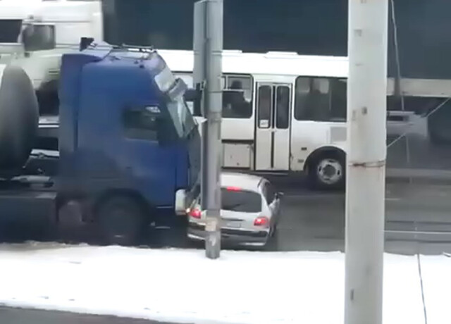 В Костроме на улице Подлипаева большегрузный автомобиль «буксировал» впереди себя легковой автомобиль. Что произошло? На этот вопрос пытаются найти ответ местные жители. Говорят, что за рулем легкового автомобиля находилась девушка 53-летняя женщина. Происшествие на камеру мобильного телефона зафиксировал очевидец. Есть несколько версий произошедшего. Первая — техническая неисправность грузовика. Вторая — водитель не заметил перед собой легковушку. Третья версия — водитель подрезала дальнобойщика, тем самым разозлив его, в результате чего тот решил ей отомстить. По официальной версии ГИБДД Костромы, автомобиль Peugeot под управлением 53-летней женщины попал в слепую зону грузовика, когда отъезжал от продовольственного магазина. Грузовик протащил легковушку десятки метров и остановился только после того, как водителю посигналили другие водители. В результате ДТП никто не пострадал. Проводится проверка.
