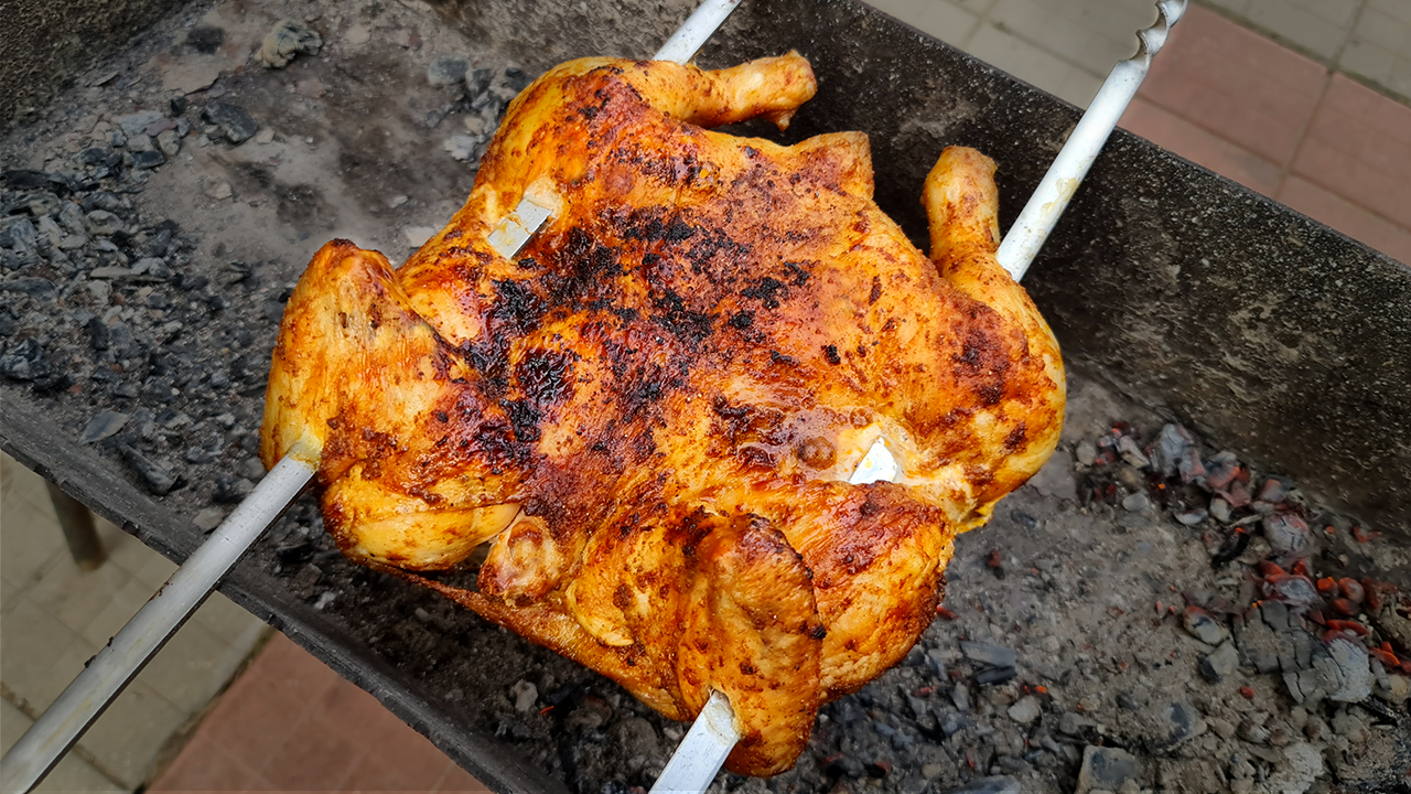 Представляю Вашему вниманию стоящий рецепт приготовления шашлыка из курицы. Мне он очень нравится из-за хорошего маринада, который отлично подходит к мясу птицы и максимально простому способу приготовления. На самом деле он готовится на столько просто, что курицу даже не надо разделять на части! Отмечу также, что из-за того, что курица готовится одним куском она получается сочнее внутри, чем курица, которую жарили разделив на части. === Для рецепта Вам понадобится === Курица – 1 шт; Растительное масло; Гранулированный чеснок – 3 ч.л; Копченая паприка – 2 ч.л; Свежемолотый перец; Соль; ==Для соуса== Сметана 20% - 100 гр; Майонез – 100 гр; Чеснок – 2 зуб; Соль;