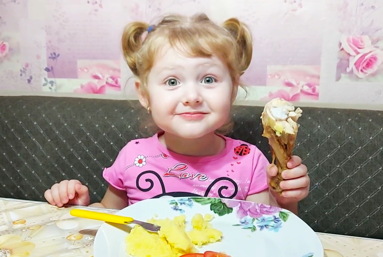 Вот наша сластёна решила покушать курочку, приготовленную любимой супругой на 23 февраля папе. Судя по Веронике курочка удалась.