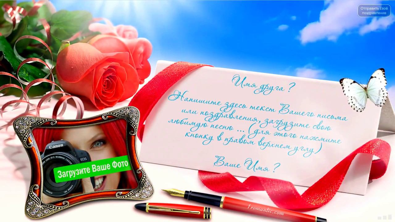 ЗАПОЛНИТЬ ОТКРЫТКУ СЕЙЧАС: https://1romantic.com/ Дорогие друзья! Вам остаётся только, написать нужный вам текст и загрузить свою фотографию. 1Romantic.com Является первым и единственным в мире сервисом интерактивных видео поздравлений. Мы используем собственную уникальную технологию, добавляя ежедневно самые новые и последние разработки программирования. У нас Вы можете найти поздравления на любой вкус, только высокого качества и разрешения. Согласитесь, всегда приятней, отправить поздравления от себя лично, чем пересылать чужие, с уже заготовленным стандартным и быстро мерцающим текстом, как рекламный баннер, пересылаемый друг-другу от тысячи к тысячам где нет Ваших Имён. Задумайтесь ! Это выглядит слишком наивно и как минимум глупо, особенно для людей которые умеют писать и читать (на мою розочку сверкалку или стикер и отвали). Теперь всё будет иначе ! Вы можете сами передать своё настроение, тем людям, которым Вы будете адресовать своё поздравление. Теперь Вы сами, творец, художник и поэт своих чувств, наполняя видео открытку своими словами, излучая только самое доброе, искреннее из своих тёплых сердец. Загрузить свою любимую фотографию или фотографию получателя, что безусловно, будет гораздо приятней и неожиданней для него) Безусловно, мы подумали и о музыкальном оформление. Наверняка, Вы будете подбирать нужные слова и фотографию под ту песню, которую Вы захотите загрузить сами, а не ту которую Вам навязывают. Ну и самое главное, Вы можете использовать функцию добавления своего голоса, программа сама наложит Ваш голос на начало загруженной песни. Поверьте это очень оригинально, особенно если Ваш друг не слышал Вас долгие годы. Такое поздравление можно сделать действительно за 30-60 сек. Но если Вы творческий человек, оно не отпустит Вас так быстро))) И Вы будете думать, сочинять, плакать, улыбаться, восхищаться, раскрыв в себе новые таланты... возможно это станет Вашим первым собственноручным творением . Удачи Вам ! С уважением, Ваши Романтики ! Краткий список предлагаемых нами поздравлений... Поздравления с днем рождения женщине. Поздравления с днем рождения мужчине. Поздравления с днем рождения другу. Поздравления с днем рождения подруге. Поздравления с днем рождения для детей. Поздравления с днем святого Валентина. Поздравления Папе. Поздравления с днем рождения Маме. Прикольные поздравления. Видео поздравления с днем рождения. Музыкальные поздравления с днем рождения. Слайд-шоу с днем рождения. и многое-многое другое.