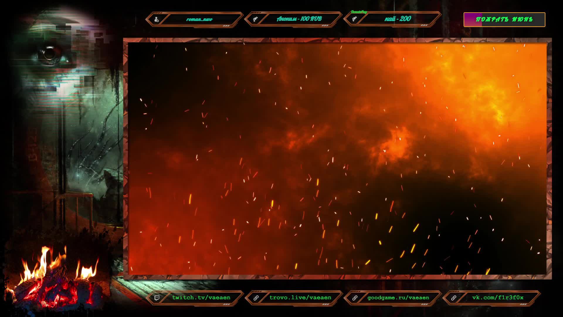 Если хотите поддержать меня как стримера - нажмите по данной ссылке https://www.donationalerts.com/r/f1r3f0x Donate for USD, EU all world - https://new.donatepay.ru/@vaeaen Во время стрима ваше сообщение появится на экране, и будет сопровождаться голосовым диктором. Поддержка на прямую: Сбер: 2202 2010 0629 1039 Тинькофф: 2200 7008 4677 0625 Основные каналы: Twitch: https://www.twitch.tv/vaeaen GoodGame: https://goodgame.ru/channel/Vaeaen/ Trovo: https://trovo.live/Vaeaen Дополнительные: Boosty: https://boosty.to/vaeaen VKplay: https://vkplay.live/vaeaen Wasd: https://nuum.ru/channel/vaeaen YouTube: https://www.youtube.com/channel/UCsl3CyRcImUYtWiCgEdvmjQ