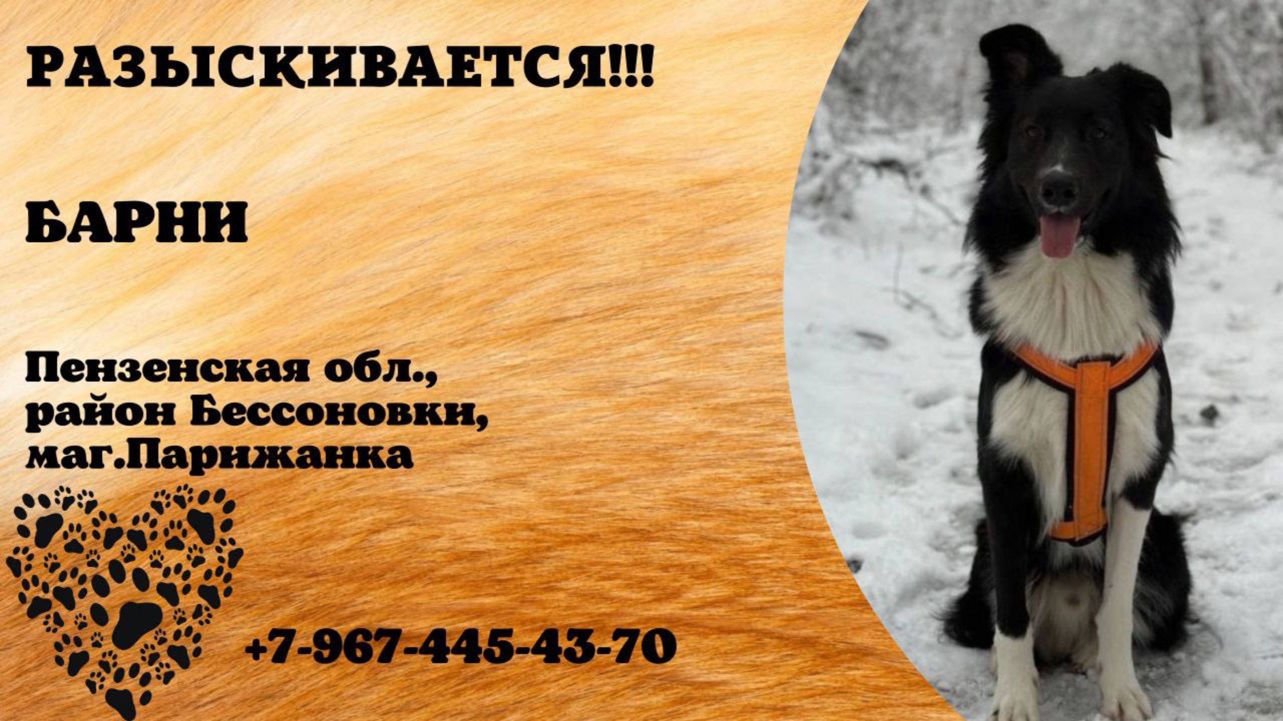 Пензенская Пенза Пропала собака Объявление о поиске пропавшего пса БАРНИ. ВОЗНАГРАЖДЕНИЕ 10 000 рублей. 13 января в 10 утра в районе Бессоновки Пензенской области (ориентир - магазин Парижанка) убежал пёс по кличке Барни. Он не знает местности и это делает невозможным его самостоятельное возвращение домой в Пензу. Черно-белый, помесь овчарки и дворняги, худощавого телосложения, длинные лапы, пушистый хвост и в целом весь пушистый. Особая примета - Рыжая шлейка. Барни не простой кобель, у него сложная история. Год назад в соц сетях Макс нашел рилс с найденными щенятами в овраге близ Магнитогорска. Одна из девчонок-сестренок Барни была прострелена. Как оказалось, развлечение такое есть у нездоровых людей - стрелять в собак. Барни долго не могли пристроить - несколько месяцев он перемещался с передержки на передержку. В феврале прошлого года Макс решил, что это его псын и поехал за ним: 1200 км туда и столько же обратно, и Барни обрёл дом, любящего хозяина и друга. Из-за его непростой судьбы характер у Барни тревожный. Он очень пуглив - боится и людей, и собак. Он звонко лает и прижимает хвост. Не кусается. Так сложилось, что утром 13го января в районе пустыря Бессоновки кинолог решил сделать встречу собакам из клуба, чтобы они подружились, для развития коммуникативных навыков. И вот в этой дружелюбной обстановке Барни рванул в поле и не вернулся. Толи тревожность, толи страх, толи охота на зайцев и лис, которых волонтеры не раз встречали за эти три дня. Поиски идут практически непрерывно. Наклеены более 1000 объявлений в районах Ухтинки и Бессоновки, публикуются посты в соц сетях. 15 января Барни видели в Бессоновке, возможно, Пенза - Север, КПД, Пенза IV. Хозяева уже 3 дня практически непрерывно ищут Барни, им помогают неравнодушные граждане - волонтеры. Если вы увидите его, попробуйте его поймать за шлейку. Он добрый пёс, не должен укусить. Или хотя бы позвоните по телефонам из объявлений - 89674454370. Хозяева оперативно приедут на место. Автор https://vk.com/id184441437 Инфо https://vk.com/wall-198815410_170803 #пропала_собака#пенза