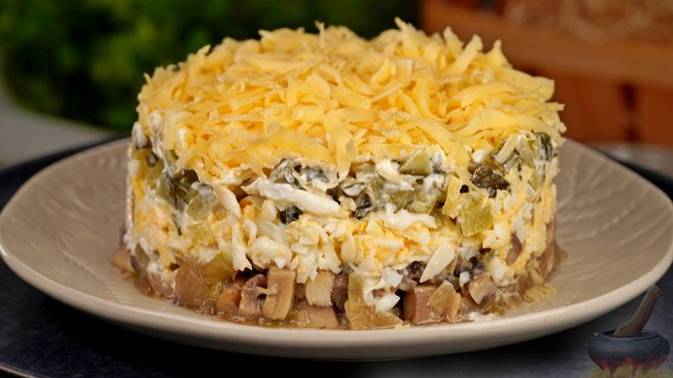 Слоёная вкуснятина. САЛАТ С ШАМПИНЬОНАМИ, ОГУРЦАМИ И СЫРОМ