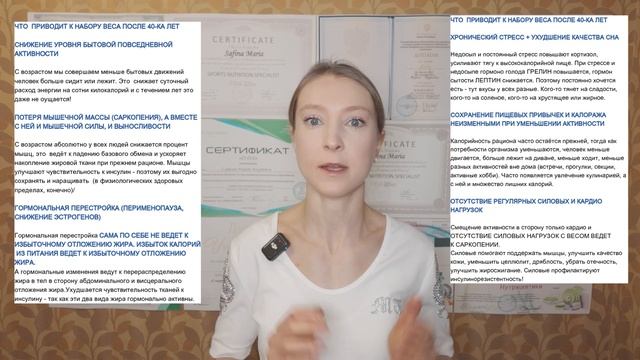 Тайм-коды: 1) 00:00 Уменьшение метаболизма с возрастом: как происходит и почему?; 2) 1:05 Как сохранить мышцы с возрастом? Какие нужны нагрузки? (исследования); 3) 3:30 Гормональные изменения с возрастом и набор веса; 4) 5:00 Почему идет набор веса с возрастом? 5) 5:48 Почему целлюлит становится более видимым? 6) 6:53 Глобальная ошибка в похудении после 40-ка лет? 7) 8:00 Сколько белка нужно в день для поддержания мышц? 8) 9:03 Три больших минуса образа жизни, которые ведут к набору веса после 40-ка; 9) 12:11 Разумный дефицит, количество белка, углеводы, омега-3, источники; 10) 16:04 Потеря мышц, целлюлит, отеки и количество белка в питании; 11) 16:49 Итог: Что не работает при похудении? Что работает при похудении? 12) 18:16 Почему важно качество и количество белка, жиров, углеводов? 13) 22:08 Почему очень важно качество жиров? Источники омега-3; 14) 24:35 Стресс. Сон. Почему влияют на переедание?; 15) 25:37 Мотивация к действию! Итоги. Дополнительные видео-материалы: Минусы краткосрочных диет: https://www.youtube.com/watch?v=CrOxmQE-HuM&t=630s Видео про отказ от сахара (отрицательная сторона отказов, геройств, ограничений): https://www.youtube.com/watch?v=QW__zzeVXN8&t=1215s&pp=0gcJCTwKAYcqIYzv Средиземноморский тип питания: https://www.youtube.com/watch?v=NCQSBhrPqQg&t=8s Мой Телеграм: https://t.me/fitnessmaria Мой сайт: https://maria-safina.ru/ Запись на мой авторский курс «Искусство Здорового Рациона»: https://maria-safina.ru/iskusstvo-zdorovogo-raciona Участие в группе «Готовый Рацион и Разборы Составов Продуктов»: https://maria-safina.ru/gotovye-raciony-ot-nutriciologa Участие в марафоне Здоровых Привычек Марии Сафиной: https://kurs.maria-safina.ru/marafon-zdorovyh-privychek-marii-safinoj Запись на мой авторский курс «Пищевые Жиры и Здоровье»: https://kurs.maria-safina.ru/kurs-pishchevye-zhiry-i-zdorove Мои сертификаты и дипломы: http://maria-safina.ru/obo-mne Бесплатная книга «Искусство Здорового Рациона» на Литрес: https://www.litres.ru/book/mariya-safina/iskusstvo-zdorovogo-raciona-dokazatelnaya-nutriciologiya-dly-70496446/ Подробнее о «Дне Здоровья» и других корпоративных программах: https://maria-safina.ru/den-zdorovya Исследования: 1. Kodoth V., Adverse Changes in Body Composition During the Menopausal Transition, 2022. — обзор изменений состава тела при менопаузе (увеличение висцерального жира). 2. Coelho-Junior HJ et al., Protein Intake and Sarcopenia in Older Adults, 2022. — роль белка в поддержании мышечной массы. 3. Kim JY et al., Optimal Diet Strategies for Weight Loss and Maintenance, 2020 (обзор). — стратегии похудения. 4. Isenmann E. et al., Resistance training alters body composition in middle-aged women, 2023. — данные о пользе силовых тренировок для женщин среднего возраста. 5. Kravitz HM et al., Sleep, Health, and Metabolism in Midlife Women, 2018. — влияние сна на метаболизм у женщин. 6. Ruiz-Castell M. et al., Estimated visceral adiposity is associated with risk of cardiometabolic disease, 2021. — висцеральный жир и кардиометаболический риск.