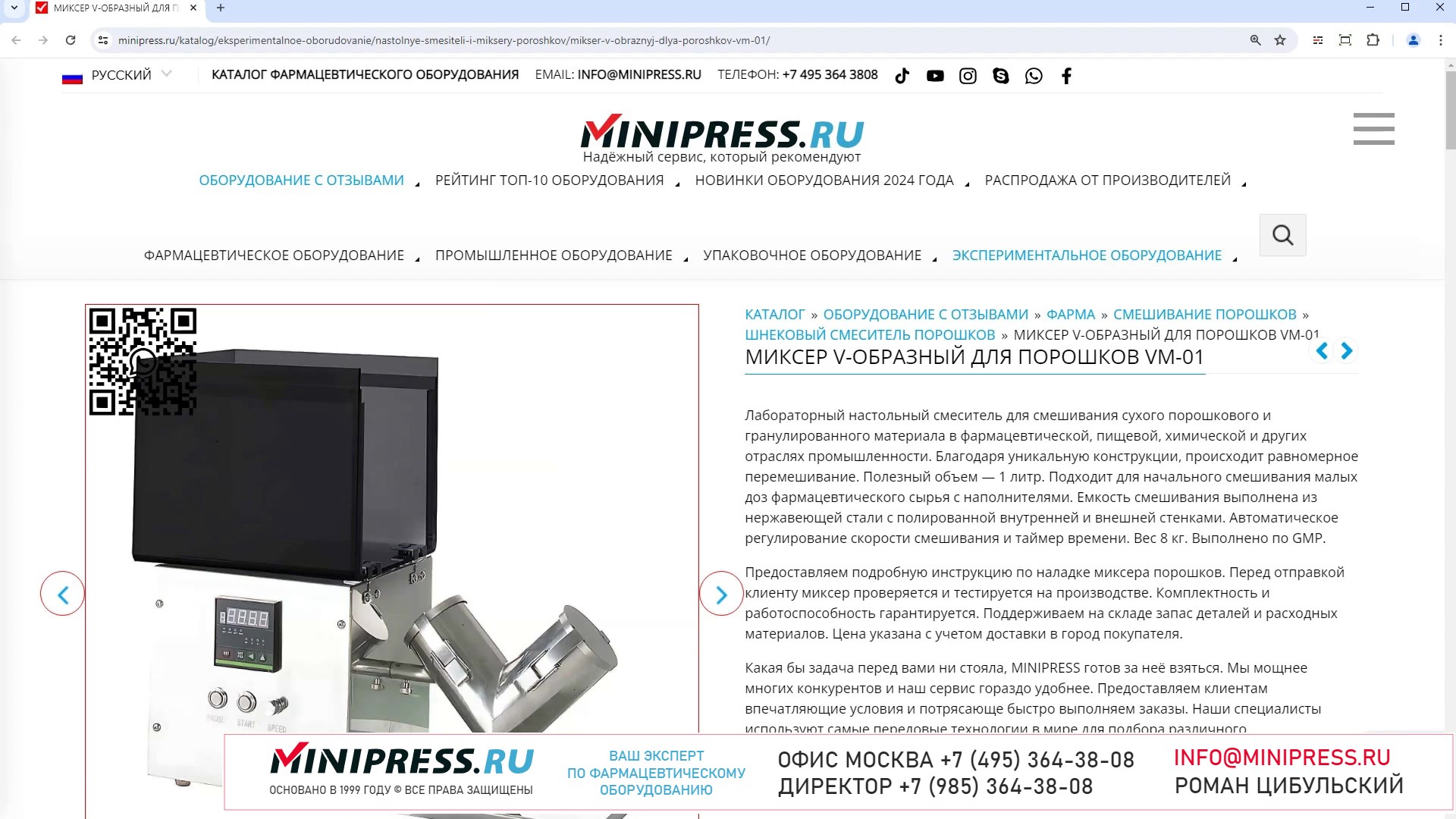 Каталог компании MINIPRESS.RU предлагает большой выбор оборудования ДЛЯ ПЕЧАТИ НА УПАКОВКЕ срока годности и даты производства. Консультируем по выбору Датеров, Кодинг Машин, Нумераторов. В нашем ассортименте машины для печати логотипов на стеклянных ампулах, картонных коробках, желатиновых капсулах Компания Романа Цибульского MINIPRESS.RU занимается поставкой большого ассортимента фармацевтического оборудования из Китая, Кореи, Индии, Европы и других стран. Мы выполняем работы по поиску, подбору, закупке, доставке, и таможенной очистке оборудования с доставкой в любой город России и стран СНГ. Основатель и ведущий специалист компании - Роман Цибульский. Компания MINIPRESS.RU (зарегистрированный товарный знак) основана в 2000 году. Онлайн каталог оборудования MINIPRESS.RU ежедневно посещают несколько тысяч человек. Мы развиваем крупные каналы в социальных сетях, посвященные тематике фармацевтического оборудования. Вы можете посмотреть видео ролики об оборудовании, которым мы занимаемся. Фактически у нас самый большой в России многоязычный каталог фармацевтического оборудования с фотографиями, описаниями, и что более важно с ценами и видео демонстрацией оборудования в работе. Подбор оборудования и консультации ведет сам владелец компании - Роман Цибульский. Компания имеет огромный опыт в работе с различным оборудованием, технологиями. Помогаем клиентам выбрать модель фармацевтического оборудования, которое сможет решить поставленную задачу. Наши специалисты помогают рекомендациями в решении проблем по эксплуатации оборудования. Наша компания имеет офис в г.Шанхай и несколько менеджеров, которые помогают в работе с китайскими поставщиками. Мы долго сотрудничаем и дружим с этими специалистами. Китайские поставщики ценят нас как постоянных партнеров. Роман Цибульский Директор компании Минипресс Поставка фармацевтического оборудования в Россию Пишите: info@minipress.ru Gmail: boss.minipress@gmail.com Офис в Москве +7(495)364-38-08 Мобильный +7(985)364-38-08 (WhatsApp) Каталог оборудования https://www.Minipress.ru/katalog/ МИНИПРЕСС.РУ В СОЦИАЛЬНЫХ СЕТЯХ FB https://facebook.com/roman.tsibulsky YOUTUBE https://www.youtube.com/@farmacevticheskoe_oborudovanie INSTAGRAM https://www.instagram.com/farmacevticheskoe_oborudovanie/ #новости #поставки #крышки #доходы #фасовка #эмульгатор #каталог #пресс #менеджмент #мельница