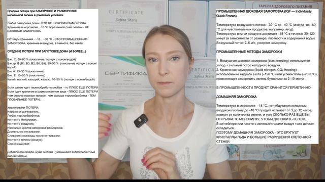 Тайм-коды: 1) 00:00 Разрушения клеток при заморозке; 2) 1:57 Потери витамина С при заморозке зелени; 3) 3:33 Внешний вид размороженной зелени. Клетчатка; 4) 5:20 Разрушение пектиновых веществ; 5) 6:30 Хлорофилл - разрушение; 6) 7:20 Окисление витамина С, потери витаминов гр. В; 7) 8:28 Губительные способы разморозки; 8) 9:22 Потери витаминов или почему свежая зелень даже зимой - оптимальный вариант!; 9) 12:10 Потери вит. гр В; 10) 12:28 Потери вит. A, D, E, K; 11) 13:14 Шоковая заморозка; 12) 13:38 Минералы: потери; 13) 14:16 Почему покупать свежую зелень выгодно для здоровья; 14) 18:30 Антиоксиданты; 15) 18:42 Факторы, которые ведут к потере нутритивной ценности зелени; 16) 22:02 Красная соленая рыба: в чем вред для здоровья? 17) 27:14 Как перестать замораживать зелень? 18) 27:44 Какую зелень я покупаю? 19) 32:40 Супер-антиоксидантная сила рыбы (щадящая обработка, не соленая, не копченая) + свежая зелень. Дополнительное видео: Костный бульон: https://www.youtube.com/watch?v=2aSFHVCYCF4&t=1s Мед: https://www.youtube.com/watch?v=P8YHJmuf4bU&t=756s Мед и перга: https://www.youtube.com/watch?v=iwrJcToKvao&t=31s Хлорофилл: https://www.youtube.com/watch?v=i9t8_MYj9pA&t=530s Мой Телеграм: https://t.me/fitnessmaria Мой сайт: https://maria-safina.ru/ Запись на мой авторский курс «Искусство Здорового Рациона»: https://maria-safina.ru/iskusstvo-zdorovogo-raciona Участие в группе «Готовый Рацион»: https://maria-safina.ru/gotovye-raciony-ot-nutriciologa Участие в группе «Разборы Составов Продуктов»: https://t.me/tribute/app?startapp=szwD Участие в марафоне Здоровых Привычек Марии Сафиной: https://kurs.maria-safina.ru/marafon-zdorovyh-privychek-marii-safinoj Запись на мой авторский курс «Пищевые Жиры и Здоровье»: https://kurs.maria-safina.ru/kurs-pishchevye-zhiry-i-zdorove Мои сертификаты и дипломы: http://maria-safina.ru/obo-mne Бесплатная книга «Искусство Здорового Рациона» на Литрес: https://www.litres.ru/book/mariya-safina/iskusstvo-zdorovogo-raciona-dokazatelnaya-nutriciologiya-dly-70496446/ Подробнее о «Дне Здоровья» и других корпоративных программах: https://maria-safina.ru/den-zdorovya Исследования, использованные в видео: 1. Review — Antioxidant Activity in Frozen Plant Foods: Effect of Freezing and Frozen Storage Conditions (Neri L. et al., 2020). 2. Li D., Effects of freezing on cell structure of fresh cellular food materials — A review (2018). 3. Takahashi D., Responses of the Plant Cell Wall to Sub-Zero Temperatures (2021). 4. Zhang F. et al., Effect of Long-Term Frozen Storage on Health-Promoting Compounds (2021). 5. Song JY et al., Color, texture, nutrient contents, and sensory values of frozen/thawed vegetables 6. Tosun BN et al., Influence of commercial freezing and storage on vitamin C 7. Практические рекомендации по бланшированию — национальные руководства (NCHFP, UGA).