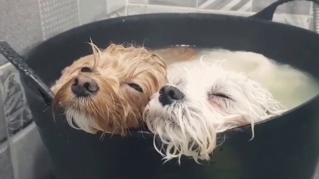 Два пса кайфуют в ёмкости с тёплой водой. #собаки #милота #купание #кайф