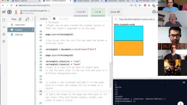 What we worked on: Today we used JavaScript to add elements to the page. We used CSS to style these elements. We used JS to dynamically add classes and we finished by creating a mock page with a headline paragraph. Here's the link we're using for today's beginner class ??https://repl.it/@cranbury/blueRectangleTest ?Notes: https://www.w3schools.com/jsref/obj_mouseevent.asp If you're interested in signing up for some individual tutoring sessions click here ?? https://www.bogotabootcamp.com/lessons