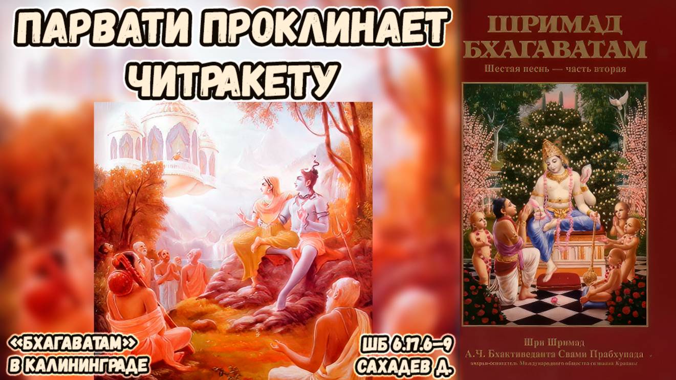 Парвати проклинает Читракету. Сахадев д. ШБ 6.17.6–9 00:00 Проклятие Парвати Читракету отпускает шутливое замечание в адрес Господа Шивы. В результате Читракету получает тело асура-демона. Всё в материальном мире зависит от прошлых поступков. Все положения в мире временны и призрачны. Господь Шива остается невозмутимым и улыбается. Господь Шива понимает намерение Читракету. Мудрецы не считают слова Читракету оскорблением. 19:46 Читракету и милость Господа Читракету получил милость от Господа Вишну. Он может путешествовать между планетами и окружен женщинами, поющими славу Господу. Читракету не испытывает проблем с топливом и может передвигаться без ограничений. Читракету видит, как Парвати ведет себя фривольно с Шивой. Мудрецы должны были бы покинуть место, если бы слова Читракету были восприняты как оскорбление. Они видят, что мысли Читракету чисты и не оскорбительны. Господь Шива не реагирует, так как Читракету действует из сострадания. 28:22 История с Дашей Дакша оскорбляет Господа Шиву в собрании мудрецов. Шива, несмотря на свое положение, вынужден выразить почтение Дакше. Дакша разгневан, но Шива покидает собрание, понимая, что критика неоправданна. 33:10 Ачинтья-бхеда-абхеда-таттва Кришна учит, что нет разницы между раем и адом для чистого преданного. Для него материальный мир — это декорации, а настоящая жизнь — в духовном мире. Кришна одновременно находится на трансцендентном уровне и принимает служение от низших существ. Кришна принес философию ачинтья-бхеда-абхеда-таттва, которая учит о непостижимости одновременных различий и единства. Это философия, которая объясняет, как живое существо и Господь могут быть едины и различны одновременно. Обсуждение единства и различий в философии. Имперсонализм и атеизм как крайности. Важность понимания различий и единства в духовном развитии. Двойственность духовного и материального миров. 42:16 Важность выполнения долга и сострадания Опасность и последствия его действий. Ошибки приводят к последствиям, которые могут быть неожиданными. Ошибки помогают учиться и понимать, как правильно действовать. Учеба состоит из проб и ошибок, которые могут быть не всегда успешными. Важно действовать, даже если не уверен в правильности решения. 57:13 Критика и ответственность Недалекие люди могут критиковать, но это не должно быть поводом для их наказания. Преданные должны брать на себя ответственность за свои действия. Иногда лучше промолчать, чтобы не создавать проблем. Господь принимает даже самые необычные формы служения, как, например, шкурки от бананов. Важно учиться принимать служение таким, какое оно есть, и не критиковать. Преданные должны стремиться к совершенству, несмотря на свои ошибки. Встреча с преданным из Индии показала, как важно учиться у великих людей. 01:08:42 Реализация и вера Проповедник утверждает, что нужно вернуться в царство Бога. Прабхупада реализовал святое имя Господа не только на уровне текста или эмоций. Он утверждает, что каждый может достичь этой реализации, повторяя святое имя Господа. Прабхупада объехал всю землю, написал много книг и открыл множество центров. Формальная логика может быть правдоподобной, но сердце открывается через любовь. Любовь к Господу может быть безумной и иррациональной. 01:14:23 Единство и различия Прабхупада понимал единство и различия одновре