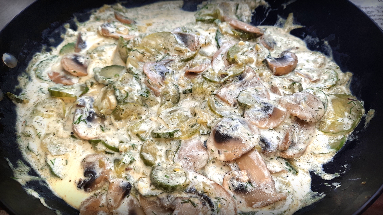 Огурцы, тушенные с шампиньонами в сметане / необычный рецепт жареных огурцов