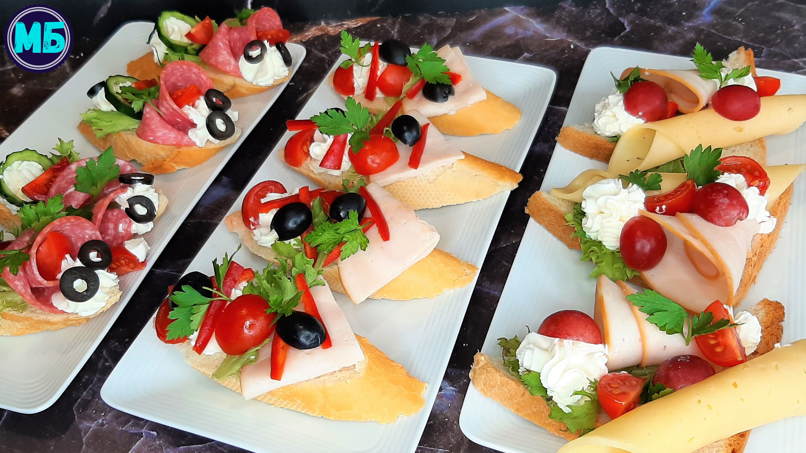 1 закуска тостовый хлеб сыр слайсами 3 шт. корбанат 3 шт. виноград розовый 4-5 шт. листья салата помидоры черри 2-3 шт. сливочный сыр 2 ст.л. петрушка 2 закуска багет 4 кусочка карбонат 4 кусочка сливочный сыр 2 ст.л. маслины 5-6 шт. болгарский перец 1/2 шт. помидоры черри 3-4 шт. листья салата петрушка 3 закуска багет 4 кусочка салями 4 кусочка сливочный сыр 2 ст.л. огурец 3-4 слайса маслины 5-6 шт. помидор черри 3-4 шт. листья салата петрушка