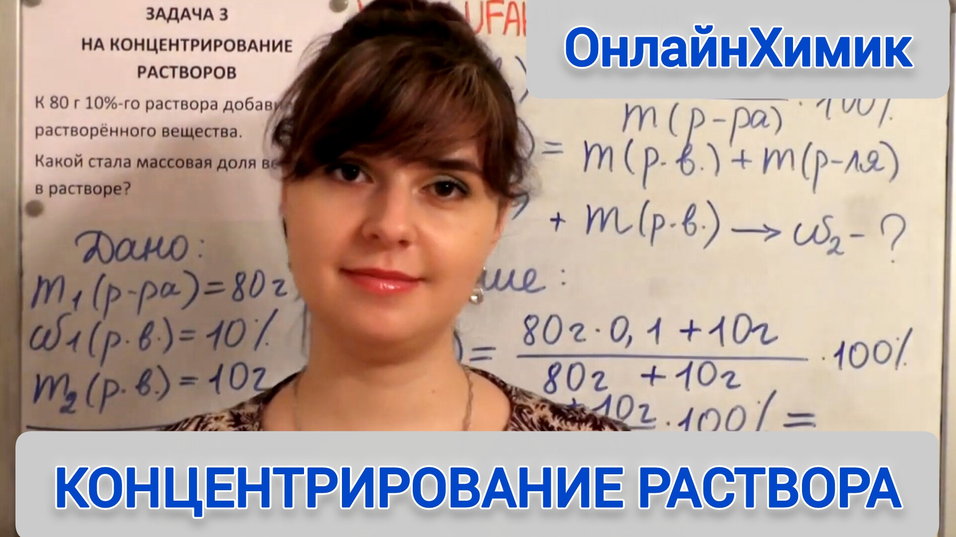 Первоисточник от 04.11.2015: https://youtu.be/w2xHIykdfZ8 Опыт подготовки к ЕГЭ по химии с 2009 года (индивидуальное обучение и онлайн-курсы). Дистанционно — с 2012 года. https://youtube.com/onlinehimik 👩🏻🔬 Репетитор по химии Корешкова Ирина Владимировна. 00:00 - вступление 00:35 - задача на концентрирование раствора 00:46 - добавление вещества =﹥ увеличивается концентрация 01:06 - схема процессов 01:39 - запишем ДАНО, НАЙТИ, РЕШЕНИЕ 02:30 - необходимые формулы для расчетов 02:50 - подробное решение задачи К 80 г 10%-го раствора добавили 10 г растворенного вещества. Какой стала массовая доля вещества в растворе? 👩🎓Для связи: 📲https://t.me/onlinehimik_Koreshkova 📧Электронная почта info@onlinehimik.com 🤝 О репетиторе и ее учениках в ТГ https://t.me/onlinehimik/3 ТГ Видеоуроки https://t.me/onlinehimik_com https://www.onlinehimik.com https://www.onlinehimik.ru ВК https://vk.ru/onlinehimik_koreshkova ВК https://vk.ru/onlinehimik Рутуб https://rutube.ru/channel/75267691 #ОнлайнХимик