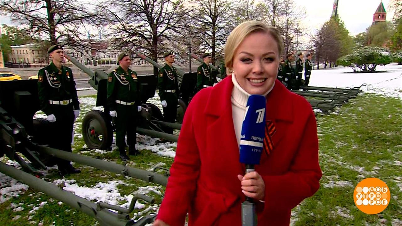 Анна Солдатова ведет репортаж с Кремлевской набережной, куда прибыл салютный дивизион. Расчеты выставляют орудия на позиции и проводят «тихую репетицию».
