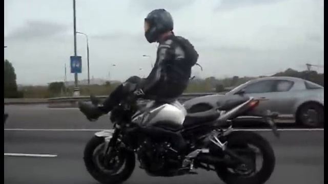 Гонщик на мотоцикле на оживленной трассе демонстрирует свое умение управлять мотоциклом . Он крутой и делает (делал) все правильно или нужно все-таки было дожить до глубокой старости?