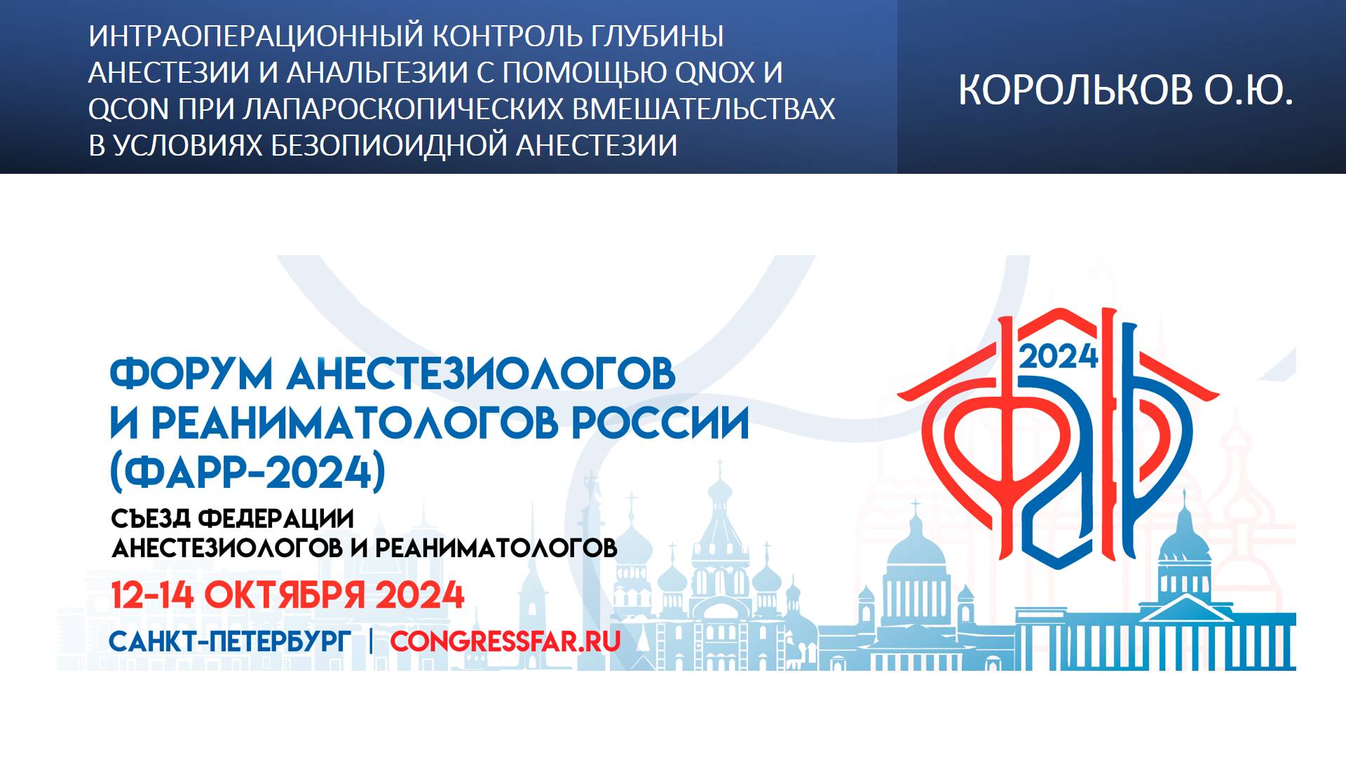 Видеозапись ФАРР-2024, XXII съезд Федерации анестезиологов и реаниматологов 12-14 октября 2024, Санкт-Петербург. Олег Юрьевич Корольков "Интраоперационный контроль глубины анестезии и анальгезии с помощью qNOX и qCON при лапароскопических вмешательствах в условиях безопиоидной анестезии" Информация, размещенная на канале, предназначена исключительно для медицинских специалистов