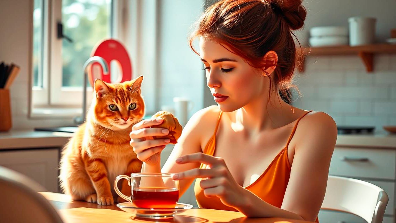Солнечный день наполняет кадр сочными тёплыми красками. В кадре — уютная кухня и обеденный стол, за которым расположилась красивая девушка 20 лет. Её рыжие волосы собраны в аккуратный пучок, а образ дополняет стильная молодёжная майка без рукавов. В руках она бережно держит вкусную булочку, зависшую над чашкой с чаем. На лице читается искреннее предвкушение. Рядом сидит забавный рыжий кот и с нескрываемой завистью наблюдает за угощением. Девушка с удовольствием откусывает булочку. Но вдруг кот-проказник неожиданно бьёт лапой по её руке! Булочка летит прямо в напиток, поднимая фонтан брызг. Чай разлетается во все стороны, обрызгивая майку девушки. Девушка вскрикивает от неожиданности: «Ах!». И кот, и хозяйка замирают в полном шоке. #КотПроказник #РыжаяКрасавица #КотИБулочка