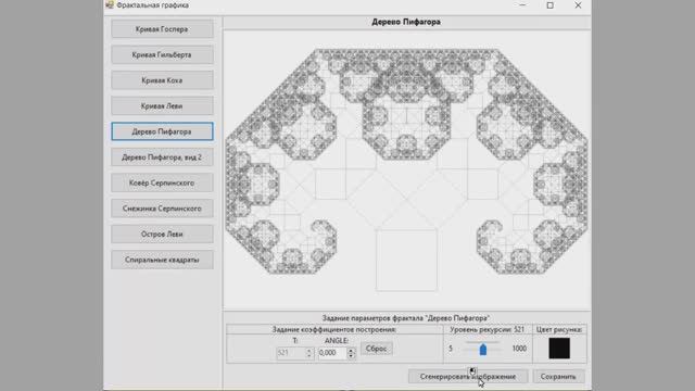 https://kursovik.com/programming/102690049.html Программа на Visual С# .NET 2019 в WinForms. В программе реализовано 10 разновидностей фракталов: 1. Кривая Госпера. 2. Кривая Гильберта. 3. Кривая Коха. 4. Кривая Леви. 5. Дерево Пифагора. 6. Дерево Пифагора-2. 7. Ковёр Серпинского. 8. Снежинка Серпинского. 9. Остров Леви. 10. Спиральные квадраты. Область, где рисунок и параметры фракталов, динамичная (меняется в зависимости от того, какой фрактал выбран). Над областью построения картинки показывается подпись, какой фракталов выбран. Там, где "задание параметров", в зависимости от фрактала, меняется количество коэффициентов под определенный фрактал, так как у них разные уравнения (с подписями, на что влияет каждый коэффициент). Уровень рекурсии показывается рядом. Задание цвета рисунка. Генерация картинки только после нажатия на соответствующую кнопку и возможность сохранить полученное изображение в формате PNG. Скачать Demo-файл программы можно по ссылке: https://kursovik.com/programming/102690049/exe Приобрести исходники(все файлы проекта) данной программы Вы можете, заполнив следующую форму: https://kursovik.com/programming/102690049.html?camefrom=rutube#form Задать вопрос автору: https://kursovik.com/programming/102690049.html?camefrom=rutube#vopros Заказать отчёт(описание): https://kursovik.com/programming/102690049.html?camefrom=rutube#pz_need Заказать модификацию программы: https://kursovik.com/uniform.html?modify=102690049&camefrom=rutube Заказать новую программу (с чистого листа): https://kursovik.com/programming_order.html?camefrom=rutube Наш Телеграм-БОТ для поиска готовых работ по программированию https://t.me/kursovikcom_bot , в нашей базе более 5и тысяч готовых работ, для более эффективного поиска используйте наш Телеграм-БОТ. Список наших готовых работ по программированию: https://kursovik.com/progtopic.html Разработка программ на заказ согласно Вашему заданию: https://kursovik.com/programming_order.html Мы пишем программы практически на всех языках программирования, работаем с различными базами данных, выполняем как мелкие задачки, так и крупные проекты. Разрабатываем и запускаем в работу ЧАТ-БОТы. Обращайтесь - всегда будем рады Вам помочь! Если нужно переписать данную программу на другой язык программирования - обращайтесь - сделаем. Адрес нашего сайта: https://kursovik.com Наши контакты: https://kursovik.com/contacts.html Наша группа ВК: https://vk.com/kursovik (всем подписчикам скидка 5%) Наш Телеграм-канал: https://t.me/kursovik (всем подписчикам скидка 5%) Наш Дзен-канал: https://dzen.ru/kursovik (всем подписчикам скидка 5%) Наш RuTube-канал: https://rutube.ru/channel/41864889 (всем подписчикам скидка 5%) Наш YouTube-канал: https://youtube.com/@kursovik_com (всем подписчикам скидка 5%) (скидка предоставляется на работы, выполняемые нашим сайтом на заказ (написание работы с чистого листа), скидки не суммируются :-) #программирование #фракталы #fractals