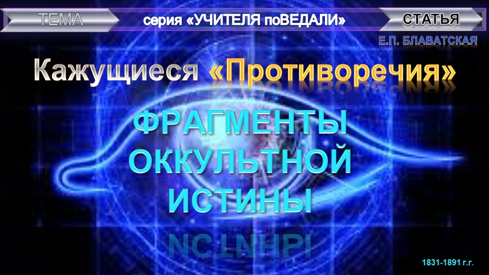 статья Блаватской Е.П. (1831-1891) "КАЖУЩИЕСЯ "ПРОТИВОРЕЧИЯ" из серии "Учителя поВедали", в которую вошли вопросы корреспондента журнала "Теософист" и данные на них ответы редактора в лице Блаватской Е.П.; также дополнительно в качестве приложения в аудио-видео файл включены извлечения терминов и определений из теософского словаря, составленного ЕПБ и ее статью ФРАГМЕНТЫ ОККУЛЬТНОЙ ИСТИНЫ, все из которых относятся к рассматриваемым вопросам о посмертных состояниях, о медиумах и их способностях для реальных и действительных их возможностях взаимодействия с умершими (развоплощенными) людьми и по другим основополагающим темам эзотерической мудрости теософии. В данную заданную тему "ФРАГМЕНТЫ ОККУЛЬНОЙ ИСТИНЫ" вошла соответствующая статья Е.П. Блаватской, составленная по форме собеседования, в ходе которого на заданные вопросы отвечает ЕПБ (Елена Петровна Блаватская); а также дополнительно включена подборка примененных в статье терминов и определений из Теософского словаря, составленного Е.П. Блаватской. "Синтез науки, религии и философии" - так обозначила суть своих трудов сама Елена Петровна Блаватская (1831-1891 г.г.) - великая наша соотечественница (урожденная Ган в г. Екатеринослав Российской империи, позднее переименованный г. Днепропетровск УССР, ныне в г. Днепр Украина), - стоявшая у истоков экстраординарного мировоззрения, основательница Теософского Общества (1875 Нью-Йорк).