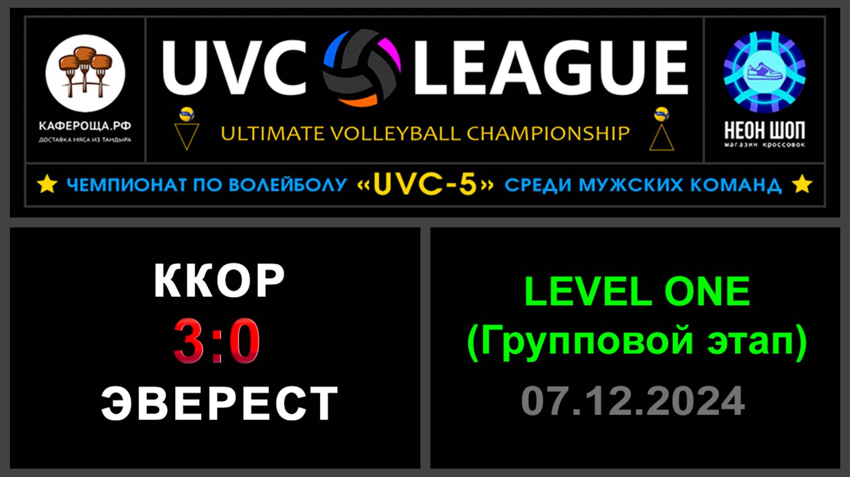 UVC-4 (Мужчины): Чемпионат UVC Лиги по волейболу среди мужских команд, 2024-2025 гг. Результаты игры: LEVEL ONE (Групповой этап) 07.12.2024 ККОР - Эверест 3:0 (30:28, 26:24, 25:17) Конкурс «Робин Гуд»: ⛔Точных попаданий не было! #UVC_ЛИГА_ЧЕМПИОНАТ_UVC_5_Мужчины