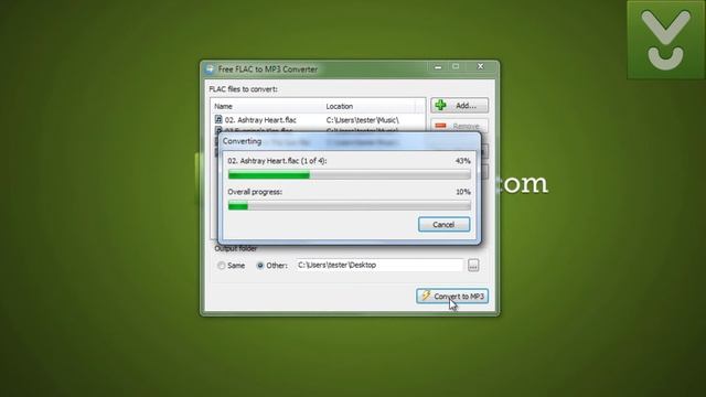 https://download.cnet.com/Free-FLAC-to-MP3-Converter/3000-2140_4-75206134.html Free FLAC to MP3 Converter offers an easy way to convert all your FLAC audio files to MP3. The program's interface is very streamlined. Just add the files you want to convert to the list (you can drag and drop them directly from Windows Explorer), select the output folder, and then click the "Convert" button. Find More Rippers & Converting Software: https://download.cnet.com/audio-rippers-encorders/windows/ __ Twitter: https://twitter.com/DownloadNow Facebook: https://www.facebook.com/downloadcom Homepage: https://download.cnet.com/