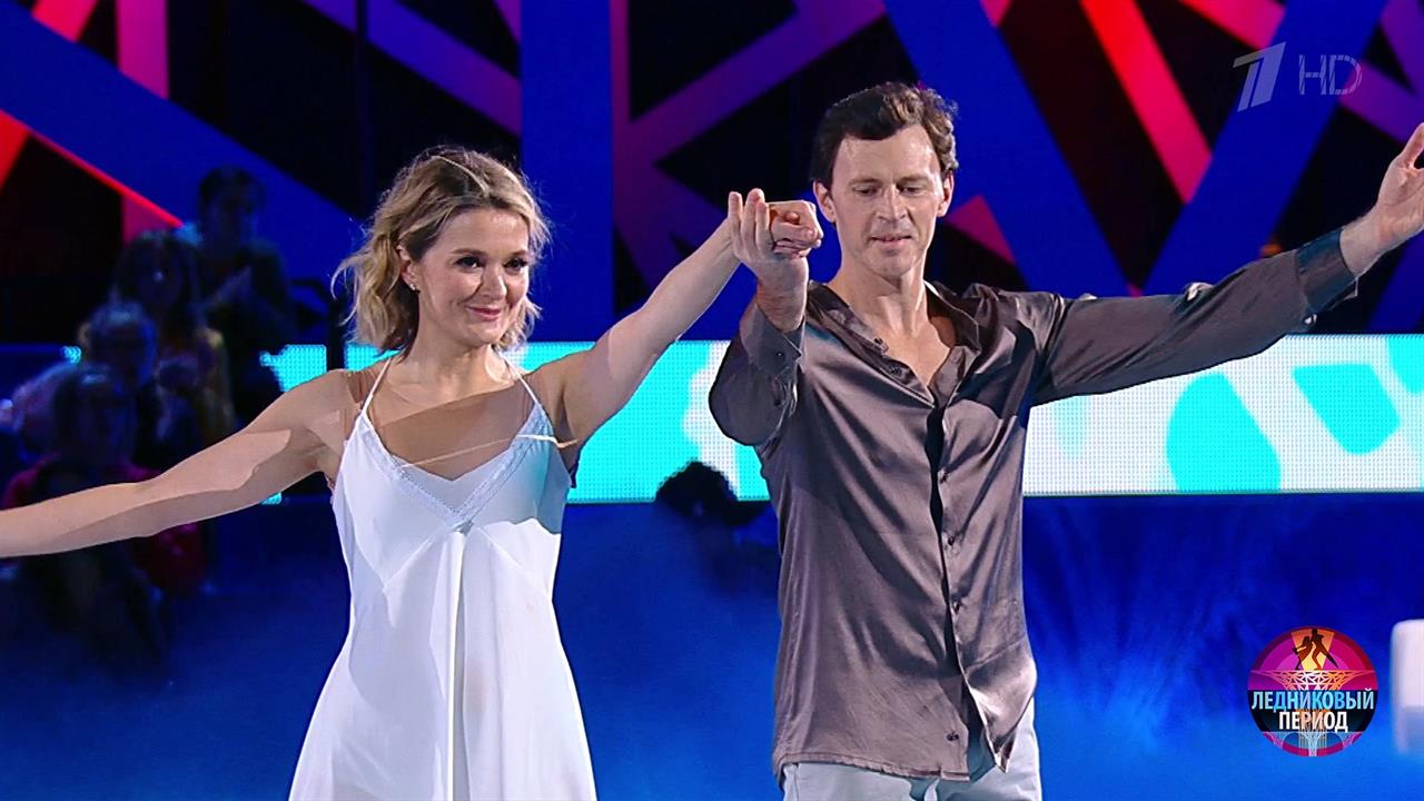 На льду – актриса и режиссер Надежда Михалкова и олимпийский чемпион Максим Маринин. Они катаются под композицию «Sunrise» группы «Coldplay».