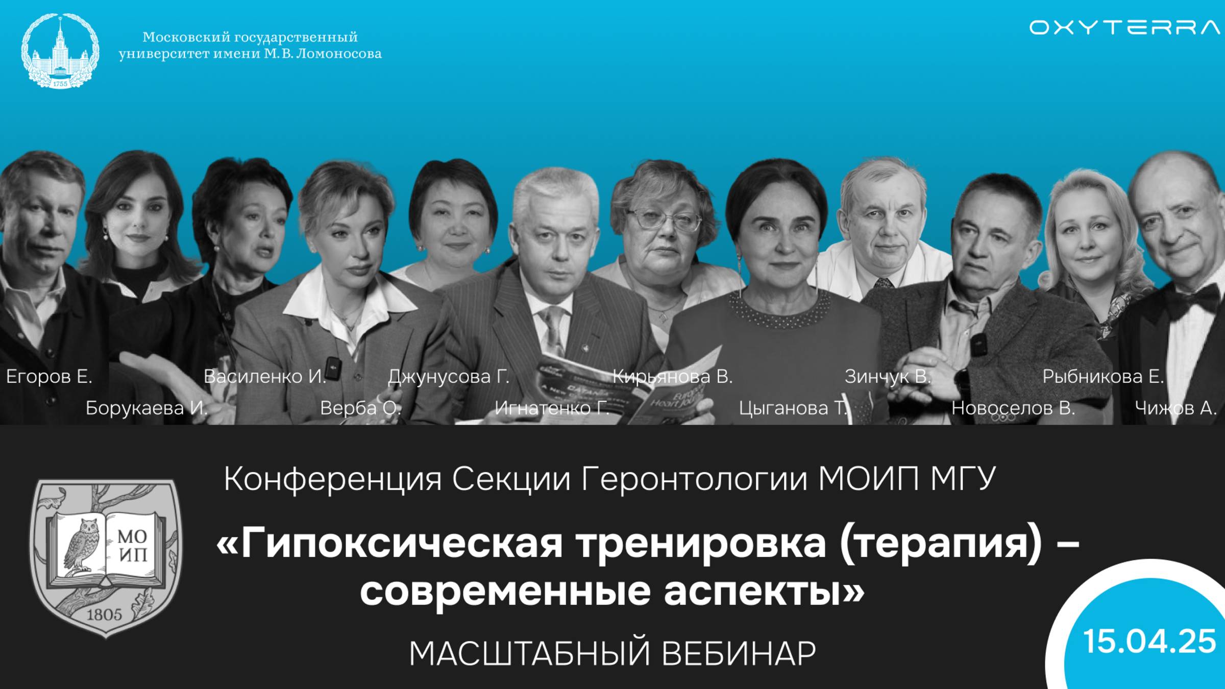 Конференция Секции Геронтологии МОИП МГУ (15.04.2025) «Гипоксическая тренировка (терапия) – современные аспекты». Конференция посвящена 220-летию научного общества, организованного при Императорском Московском Университете в 1805 году, а также 270-летию Московского Государственного Университета. Конференция стала одним из крупнейших мероприятий по обсуждению современных аспектов метода интервальной гипокси-гипероксической тренировки, продемонстрировав высокий интерес научного и медицинского сообщества к данной технологии и ее широким возможностям применения. По итогам конференции планируется выпуск сборника научных статей (включенного в elibrary и РИНЦ). Список спикеров: ◉ Чижов Алексей Ярославович – засл. деятель науки Р.Ф., д.м.н., профессор департамента экологии человека и биоэлементологии института экологии Российского университета дружбы народов: «55 лет опыта гипокситерапии» ◉ Игнатенко Григорий Анатольевич — д.м.н., профессор, ректор «Донецкого национального медицинского университета им. М. Горького»: «Гипоксическое кондиционирование в фокусе адаптационной кардиологии» ◉ Цыганова Татьяна Николаевна – д.м.н., профессор, научный консультант ООО «OXYTERA»: «Эффективность интервальной гипоксической тренировки в реабилитации больных с целью повышения адаптационных резервов организмов» ◉ Кирьянова Вера Васильевна – д.м.н., профессор, главный физиотерапевт комитета по здравоохранению Администрации Санкт-Петербурга, председатель Санкт-Петербургской Северо-Западной физиотерапевтической ассоциации, зав. кафедрой физиотерапии и медицинской реабилитации: «Возможности физиотерапии в сохранении активного здоровья лиц старшей возрастной группы» ◉ Верба Ольга Юрьевна — д.м.н., Президент Ассоциации врачей авиационной медицины (АВАМ), Сооснователь Программы «Врачи на борту», основатель сервиса поддержки пассажиров «Летать здорово»: «Высота и гипоксия: как летать безопасно» ◉ Джунусова Гульнар Султановна — директор Института горной физиологии и медицины Национальной академии наук Кыргызской Республики «Применение гипоксических тренировок для повышения резервных возможностей организма у горцев Кыргызстана» ◉ Зинчук Виктор Владимирович — д.м.н., профессор, зав. кафедрой Гродненского государственного медицинского университета Беларуси: «Гипоксия и аспросин: связь при ожирении» ◉ Егор Егоров – Dr. med, Институт превентивной медицины и Анти-медицины. Берлин, Германия: «Интервальная гипоксическая тренировка. Возможности, границы и перспективы метода» ◉ Рыбникова Елена Александровна — заместитель директора по научной работе, заведующий лабораторией Санкт-Петербург. Рыбникова Е.А., Баранова К.А., Зенько М.Ю.: «Технологии гипоксического кондиционирования: экспериментальные исследования и инновационный потенциал для здравоохранения» ◉ Борукаева Ирина Хасанбиевна — д.м.н., профессор, заведующая кафедрой нормальной и патологической физиологии человека, Государственное бюджетное образовательное учреждение Кабардино-Балкарский государственный университет. им Х.М. Берберова» Борукаева И.Х., Ашагре С.М.: «Патофизиологическое обоснование применения интервальной гипокситерапии и стимулированной гиперкапнии в лечении гипертонической болезни» ◉ Василенко Ирина Анатольевна — д.м.н., профессор, зав. лаборатории биомеди