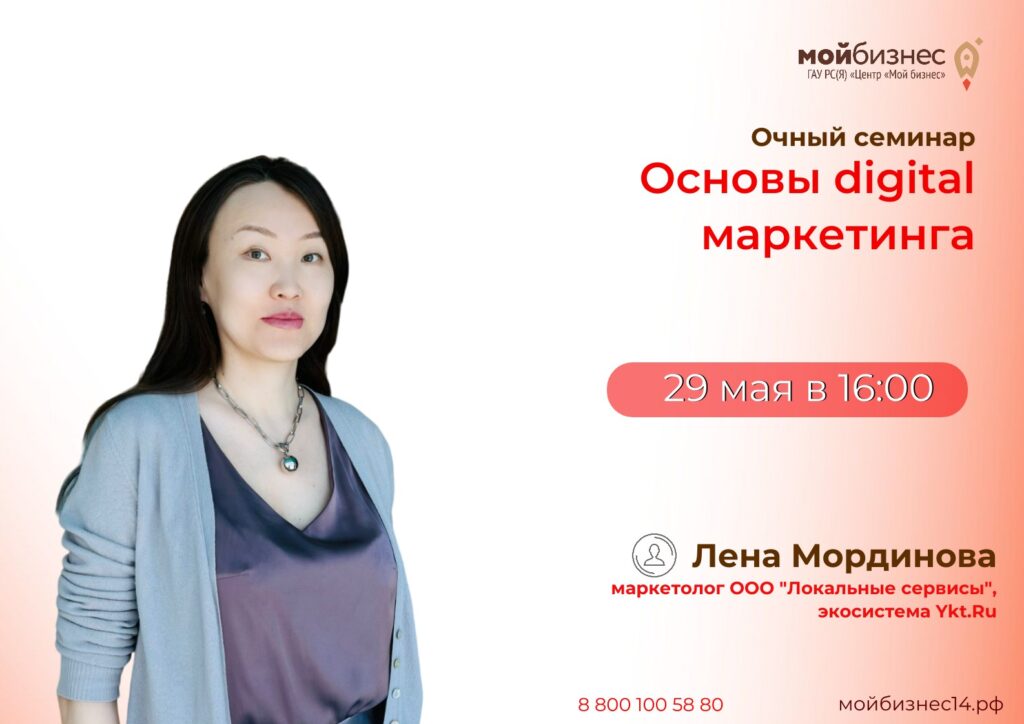 ✔️Семинар «Оcновы digital маркетинга» познакомит участников с основными понятиями и инструментами digital-маркетинга, а также научит разрабатывать и реализовывать эффективные маркетинговые стратегии. 📃В программе: Инструменты digital-маркетинга DoskaYkt как инструмент ведения бизнеса Корпоративная культура компании на примере Ykt.Ru 🎙Спикер: Лена Мординова, маркетолог ООО "Локальные сервисы", экосистема Ykt.Ru Бэкграунд: - ex. MGCom - проекты Связной (Samsung, Apple, Xiaomi и пр.), CStore (Apple), MT Сервис, Твой дом, Глория джинс, 12Storeez. - участник 500startups - ex. ВКЯ (Венчурная компания "Якутия")