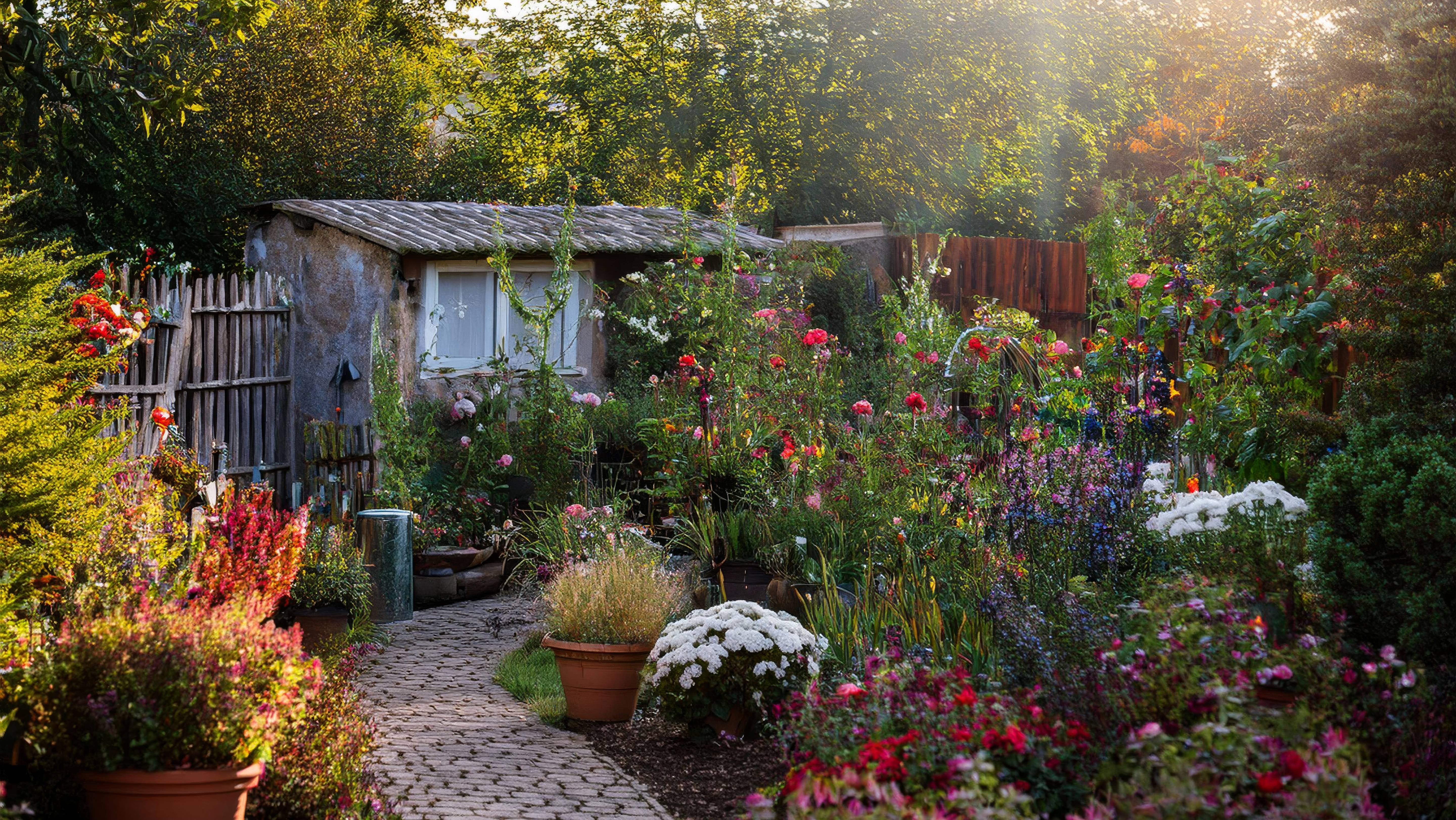 Слайд шоу из изображений волшебного цветника на Подмосковном огороде возле леса в фото-реалистичном стиле иногда с добавлением импрессионизма. Slide show of images of a magical flower garden in the Moscow region near the forest in photo-realistic style sometimes with the addition of impressionism. Заколдованный Цветник у соседки на огороде. Волшебные цветы середины сентября 2024, Подмосковье, в огороде под ЛЭП, рядом с лесом. Чистая фантазия AI (ИИ) кроме небольшой вставки видео с ромашками на фоне леса и домика хозблока. Визуально потрясающее изображение небольшого деревенского сада в Подмосковье под необычно теплым солнцем в середине сентября, когда температура достигает 25 градусов по Цельсию, отражающее необычно жаркий сентябрь 2024 года. Сцена выполнена в реалистичном стиле с оттенком импрессионизма, передающим яркие цвета и текстуры различных цветов и растений в саду. В обстановке должны присутствовать типичные элементы сада: садовые инструменты, лейки и аккуратно расставленные горшки с растениями - признаки заботы и внимания человека. На заднем плане - осенний лес. Используйте средний ракурс камеры, снимая сцену сада с точки зрения человека. Сцена залита теплым и ярким послеполуденным солнечным светом, отбрасывающим длинные тени и создающим ощущение уютного тепла, контрастирующего с ожидаемой осенней прохладой. Также включите намек на надвигающуюся засуху, чтобы напомнить зрителям о необходимости полива. A visually stunning image of a small village garden in the Moscow region under an unusually warm sun in mid-September when the temperature reaches 25 degrees Celsius, reflecting an unusually hot September 2024. The scene is done in a realistic style with a touch of impressionism, conveying the vibrant colors and textures of the various flowers and plants in the garden. The setting should include typical garden elements: garden tools, watering cans and neatly arranged pots of plants - signs of human care and attention. In the background is an autumn forest. Use a medium camera angle, shooting the garden scene from a human perspective. The scene is flooded with warm and bright afternoon sunlight, casting long shadows and creating a sense of cozy warmth that contrasts with the expected autumn chill. Also include a hint of impending drought to remind viewers to water.