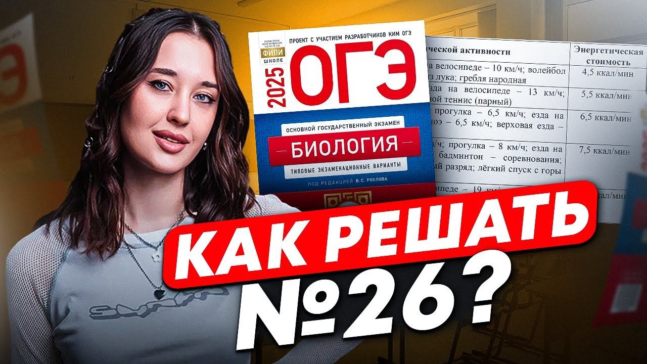 План подготовки к ОГЭ на 5️⃣ ищи в моем тг-канале —https://t.me/+0gWOVkOzMtgxZjdi Сдаешь ОГЭ в 2026 году? Пиши кодовое "ПРАЙМ" и занимай место на курсе - https://t.me/biology_el1 Если у тебя не грузит это видео, то ты можешь посмотреть его в моем ВК- https://vk.com/el_oge_bio На связи Геля Биологичка, и я готовлю к экзаменам уже более 8 лет. Средний балл моих учеников на ЕГЭ 82, на ОГЭ - 4,7Дважды сдала ЕГЭ на 100 баллов. Врач по образованию, 3 года работала в бактериологической лаборатории. Хочешь уверенно решать 26 задание в ОГЭ по биологии и получить за него максимум баллов? Тогда это видео для тебя! В этом видео ты : • Освоишь секреты успешного решения 26 задания ОГЭ по биологии. • Повторишь/выучишь необходимую теорию для решения 26 задания. • Разберешь примеры решения 26 задания в ОГЭ по биологии из Банка ФИПИ. Подписывайся на канал! На нем ты найдешь полезную информацию о том, как сдать ОГЭ и ЕГЭ по биологии в 2026 году с нуля. 00:00 Введение 02:30 Что делаем сегодня 04:10 Кодификатор по 26 заданию 07:30 Как начать решать задание 13:50 Задание 1: виды физической активности 24:40 Задание 2: доля калорийности 34:05 Задание 3: энергозатраты 44:55 Задание 4: суточные нормы и энергопотребность 53:17 Задание 5: энергетическая и пищевая ценность продуктов 1:00:50 Задание 6: доля калорийности и питательных веществ 1:12:00 Что прорешать перед экзаменом #огэбиология #огэпобиологии #биология #огэ2026 #подготовкаогэ #егэленд #биологияогэ #егэбиология #егэпобиологии #егэ2026 #биологияегэ #подготовкакегэ