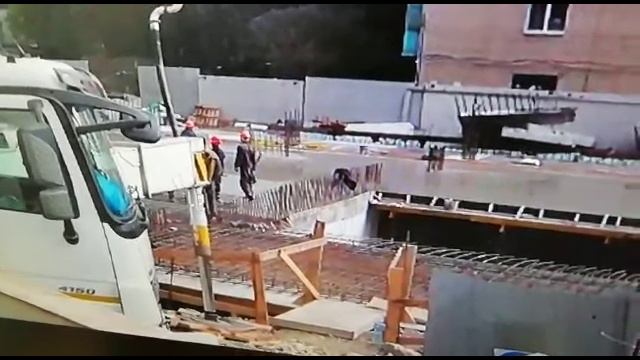 Заливка плиты перекрытия, при укладке последних кубов не выдержали подпорки. Повезло, что было воскресенье и на нижнем этаже не было рабочих, жертв нет.
