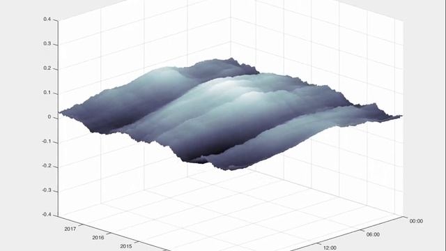 Individual intraday sentiment scores are too noisy and volatile. The video displays the evolution of sentiment surface by calendar day and by time of day depending on the degree of smoothing parameter. This smoothing surface of sentiment scores is based on News media texts that mention Apple Inc. (AAPL).