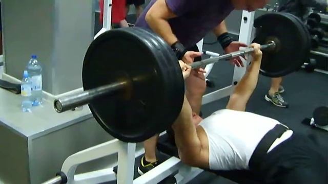 Жим штанги лежа широким хватом на горизонтальной скамье. Фитнес клуб "Магнат".