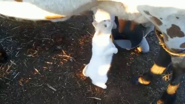 Белая кошка пьёт молоко из коровы