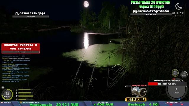Поддержка донатом https://www.donationalerts.com/r/kalyamba11 Альтернативный донат https://new.donatepay.ru/@1032463 Если стрим лагает,смотри стрим на трово https://trovo.live/s/Kalyamba_na_Ribalke ТОП 1 ДОНАТЕР МЕСЯЦА поддерживающий трансляции получит подарок в виде катушки TAIGA c40 2s Мой ВК - https://vk.com/kalyantv НИК в игре kalyan11 НАШ ДИСКОРД СЕРВЕР https://discord.gg/mSbnTJK8TB Заказ водоема на 1 час - 500р ( весь стрим 2500р ) Модерка на канале 1100р ( каждая следующая на 100р больше) Озвучка доната на 40р,50р,100р,200р,300р,500р,1000р ✅Призы в рулетке "ПРЕМИУМНАЯ" ✔ ЗОЛОТО ✔ ПРЕМ ✔ КАТУШКИ РАПТОР 40, АЗИМУТ 10000, СИЛЬВЕР 80, ТАЙГА с 30 ЮБИЛЕЙНАЯ, ✔ ПАЛКИ ПИЛКЕРНАЯ, ДОНКА МОРСКИЕ, ТОП КАСТИНГ ✔ РОД ПОД, СТУЛЬЯ ✅Призы в рулетке СТАНДАРТ : ✔ катушка "РАПТОР 40" ✔ катушка "АЗИМУТ 10000" ✔ катушка "ТАЙГА С30, С40, С30 (юбилейная)" ✔ катушки 60 для медного ( ЭВИИ, НАТОРЫ, ГОЛДА, и тд) ✔ ПИЛКЕРНОЕ УДИЛИЩЕ КОРОЛЕВА ОКЕАНА ✔ Тяжелый кастинговый спиннинг "Барракуда" ✔ Морское Донное удилище ✔ прем ( 3, 7, 30 дней) ✔ золото ( 1, 3, 5, 10, 20 ,50) ✔ билет на море ( 1, 3, 5 дней) ✔ голд наживка и др. ✅Призы в рулетке "СТАРТОВАЯ" ✔ катушка "silver80" ✔ катушка "БЕЛЫЙ КАЛИБР" ✔ катушка "Черный калибр" ✔ катушка "Протон" ✔ катушка "Нарга 6000" ✔ Набор Фидерист и спинингист ✔ Карповик Фортуна ✔ фидерные удилища ✔ прем, золото, алкашка, наживки и тд P.s Рулетка это не казино, а награда за поддержку стримера. Вечный ТОП ПОДДЕРЖКИ (11.05.2024) 1. Dimon_pokemonchik 119 784 2. Interceptor 75 508 3.Skreb79 71 261 4. une personne 68 619 5. Нарвал77 31 550