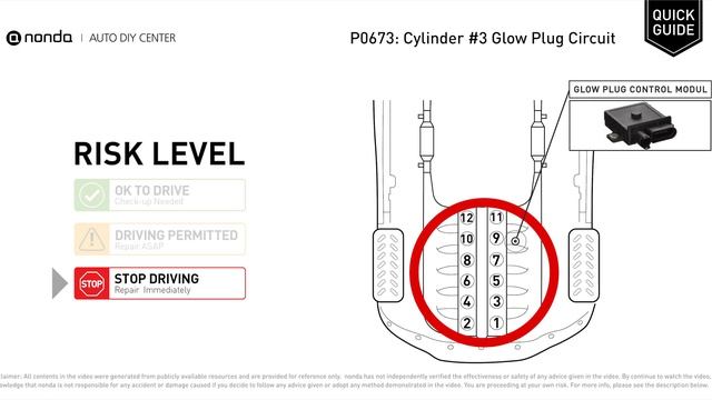 ============================= Claim your FREE engine code eraser ? https://free.nonda.co ? ============================= nonda Auto DIY Center is the biggest auto DIY video center in the World. We have videos to explain auto engine codes and their repairing methods as well as auto-saving videos to help you save money along the way. This video is to show you the cause of the P0673 engine code and its risk level. Engine Code P0673: Cylinder #3 Glow Plug Circuit. It means that the PCM detects the glow plug voltage reading does not match the manufacturer’s specifications on Cylinder #3. The Glow Plug Control Module. Multimeter. How to test The Glow Plugs. Tips and tricks for testing and replacing the Glow Plugs in your car and fixing code P0673. Tips and tricks for testing and replacing The Glow Plug Control Module in your car and fixing code P0673. Risk Level: DRIVING PERMITTED Repair ASAP *** Disclaimer for nonda *** Please read carefully the terms and conditions of nonda below. IF YOU DON’T AGREE WITH THESE TERMS, PLEASE STOP WATCHING THE VIDEOS IMMEDIATELY. By continuing to watch the videos provided by nonda, you hereby consent to the terms and conditions (including disclaimer) below. All contents provided in the videos are based on publicly available information and resources, and nonda has not independently verified the effectiveness and safety of the contents. The videos are provided as a courtesy for your reference only, and nonda is not making any representation or warranty regarding the accuracy, effectiveness, or safety of the information or advice presented in the videos. nonda hereby expressly disclaim any responsibility or liability for any accident, loss, or damage caused by your decision to follow any advice given in the videos. The users are strongly encouraged to consult a licensed professional before taking any action on your vehicle. Auto mechanic problems can vary greatly among different makes and models, and nonda does not attempt to cover all makes and models. Any information provided regarding one particular make and/or model does not necessarily apply to any other make or model. The users should consult the owner’s manual or contact the manufacturer regarding the application of the information provided to their particular vehicle. nonda recommends safe practices when working on vehicles with tools and equipment seen, recommended, or suggested in the videos. The users should read the owner’s manual for these tools or equipment carefully before using such tools or equipment. nonda expressly disclaims any liability for any injury, damage, or loss that may result from improper use of these tools and equipment. The links contained in our channel may lead to external sites, which are provided for convenience only. Any information or statements that appear in these sites are not sponsored, endorsed, or otherwise approved by nonda, and nonda is not responsible for the availability of, or the content located on or through it.
