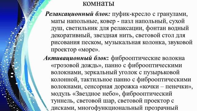 В ролике представлено использование среды темной сенсорной комнаты, где проводятся занятия для детей с ОВЗ, для снятия психо-эмоционального напряжения.