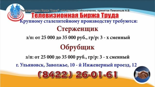 Вакансии и телефоны прямых работодателей в специализированной программе по трудоустройству "Телевизионная Биржа Труда" - г.Ульяновск