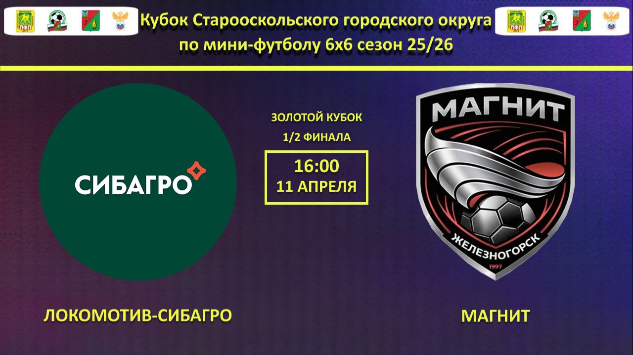 ЛОКОМОТИВ-СИБАГРО -- МАГНИТ | 1/2 финала Золотого Кубка Города по мини-футолу 6х6 сезон 25/26 | Кубок Города Старый Оскол сезон 2026 в формате 6*6 г. Старый Оскол мкр-н Надежды 14 Арена N1 Поле 1