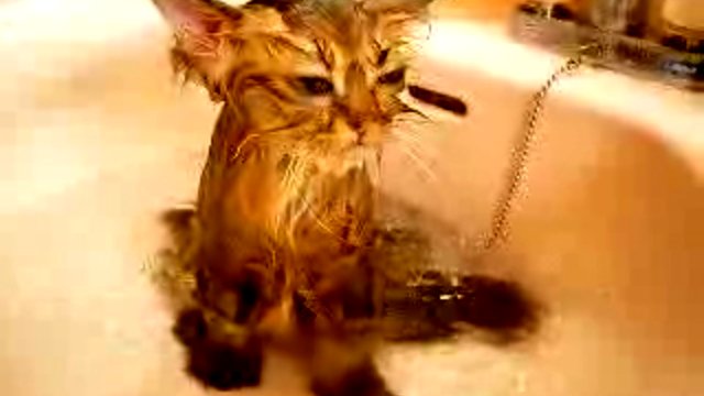 Котэ мужественно терпит водные процедуры