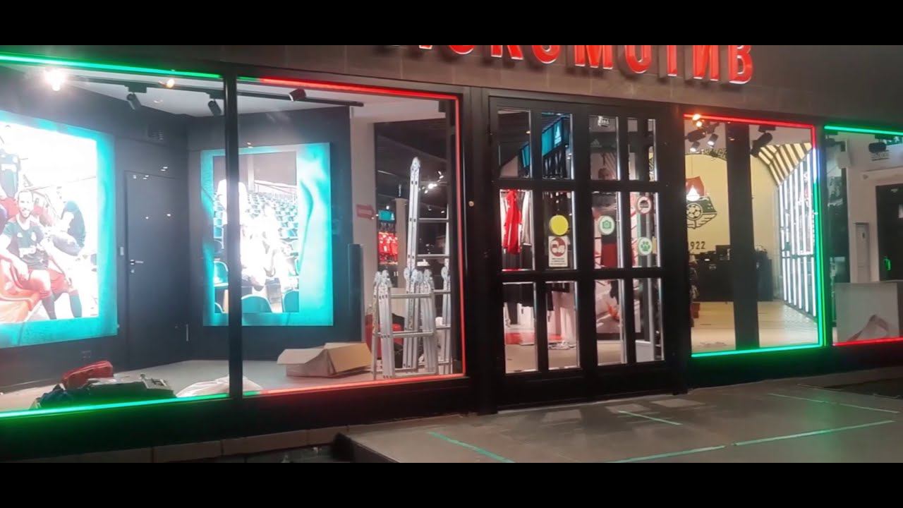 Динамическая контурная подсветка витрины выполнена в контрастных красно-зеленых цветах футбольного клуба "Локомотив". Для осуществления данного проекта использовались светодиодные RGB-ленты Arlight "Бегущий огонь". Данная лента прекрасно подходит для создания многоцветных световых эффектов различной сложности. Программирование иллюминации осуществлялось с помощью контроллера HX-802SE-2. Источниками напряжения были выбраны блоки питания HTS-200-12-Slim и HTS-150L-12. Подробнее на сайте https://arlight.moscow/ в разделе "Проекты":