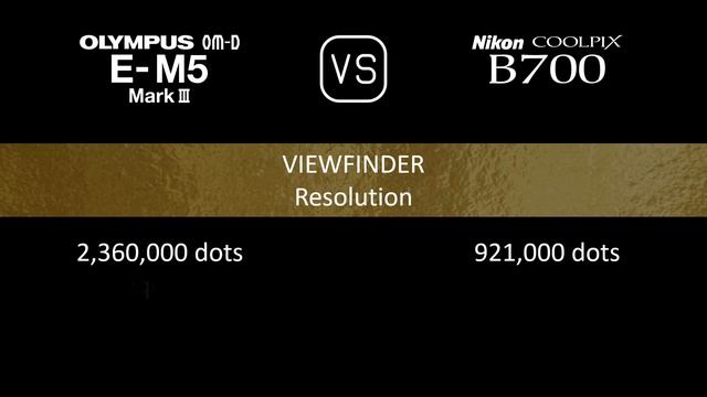 This video overviews the Olympus OM-D E-M5 Mark III and the Nikon COOLPIX B700 in a parallel comparison of specifications. Thanks for watching. If you liked this video and found it informative, make sure to subscribe for more. 00:24 LAUNCH 00:32 BODY 00:41 SENSOR 01:05 IMAGE 01:21 OPTICS & FOCUS 02:10 SCREEN 02:30 VIEWFINDER 02:46 PHOTOGRAPHY FEATURES 03:47 VIDEOGRAPHY FEATURES 04:04 STORAGE 04:08 CONNECTIVITY 04:36 PHYSICAL 04:56 MISC