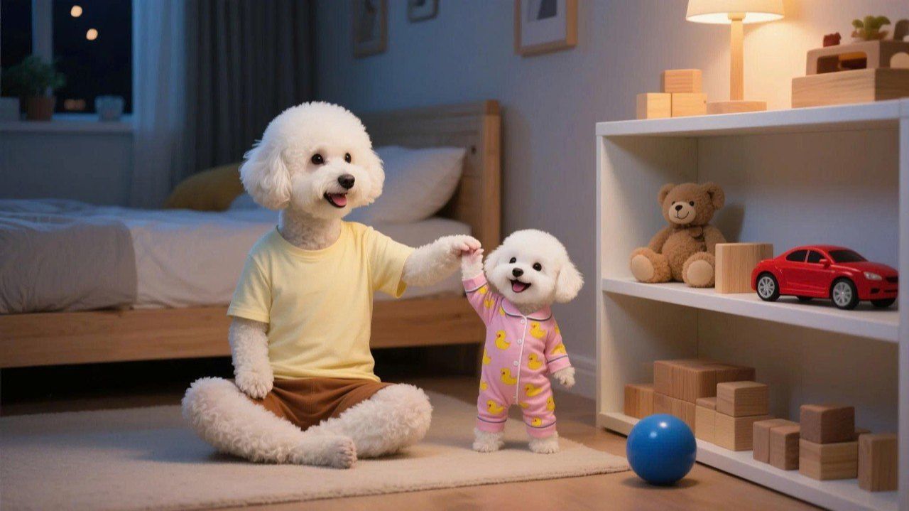 Щенок наблюдает, как папа-собака строит полку для игрушек, и учится наводить порядок 🛠️🐶