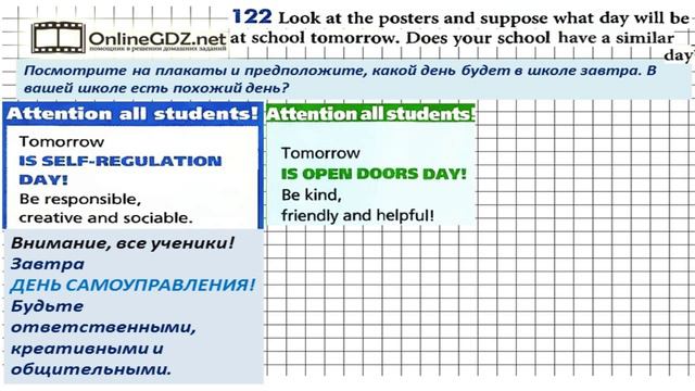 Другие решения смотри тут: https://urokitv.net/32-angliyskiy-yazyk-5-klass-biboletova-m-z Urokitv.net это школьные учебники и решебники с 1-го по 11-й класс школы. Ждем ваших предложений и пожеланий. Если вам нравится, то что мы делаем расскажите про нас своим друзьям и одноклассникам. В данном упражнении предоставлены три плаката, на котором говорится о том, что завтра будет необычный день в школе: - День Самоуправления; - День Открытых Дверей; - День Спорта / здоровья. Все прилагательные, которые используются для создания плакатов, нужно запомнить, т.к. дальше с ними будет продолжаться работа. Посмотрите наше видео, чтобы всё стало понятно. Unit 1 Section 6 Задание №122 - Английский язык "Enjoy English" 5 класс (Биболетова)