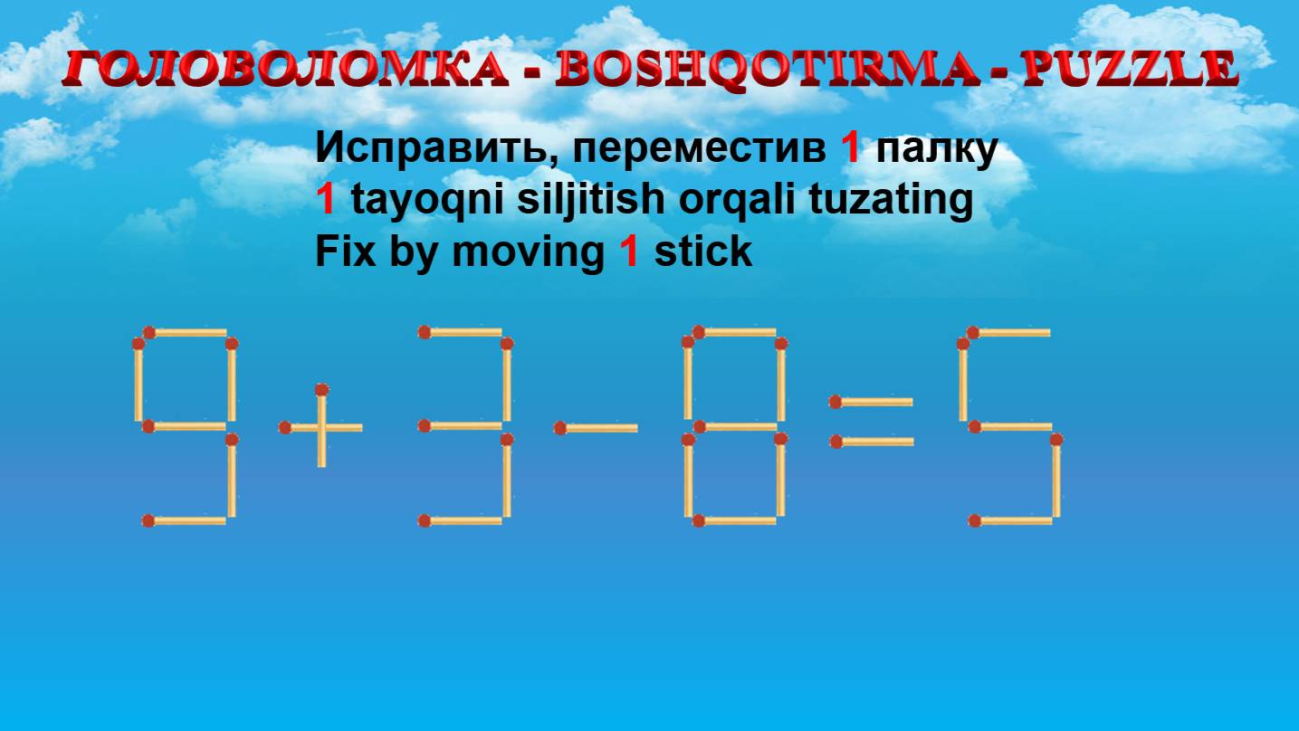ГОЛОВОЛОМКА - BOSHQOTIRMA – PUZZLE. Спичка. 9+3-8=5, 6+6+2=12, 6-4+5=8, 1+3+6=18