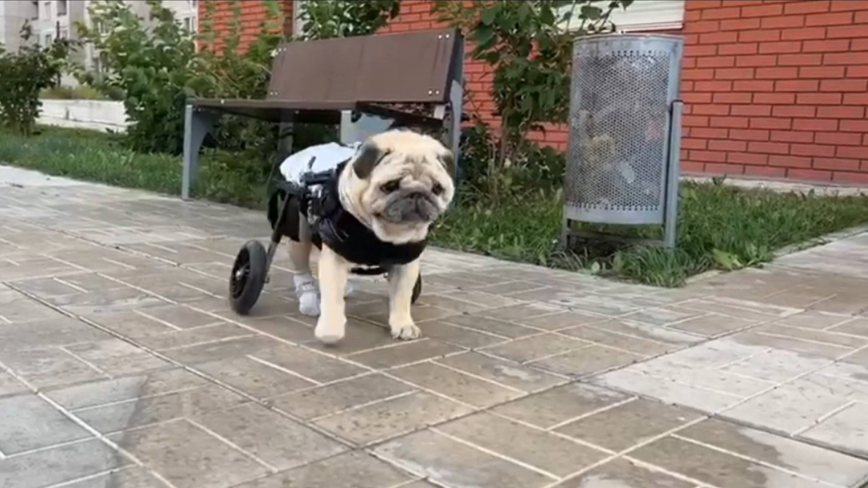 Мопсик осваивает коляску