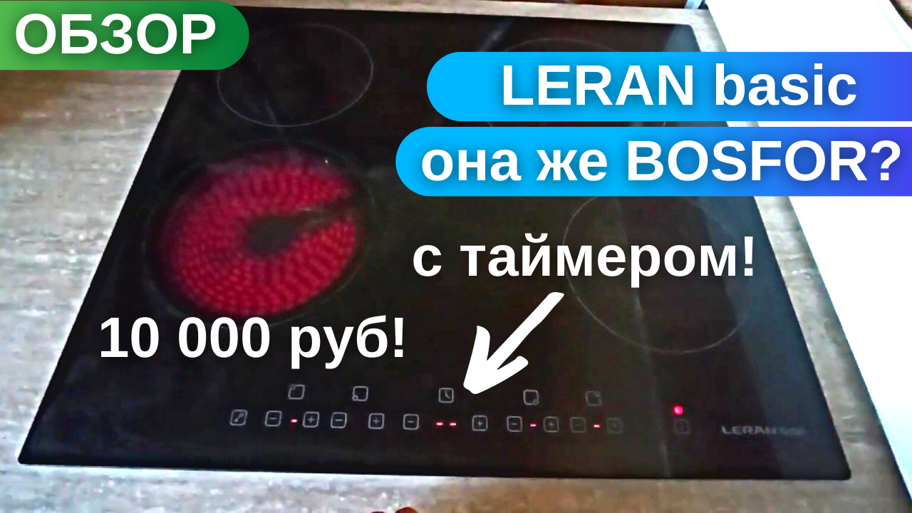 2:47 проверка чувствительности сенсора панели управления 3:17 как включить простой таймер 3:51 как включить таймер с функцией отключения конфорок 5:28 сравнение варочных панелей LERAN basic и BOSFOR Отказались от газа в пользу электричества. Почему купили варочную поверхность LERAN basic (она же BOSFOR EH 6040 BG), наш обзор и отзыв: - самая дешёвая варочная панель что нам удалось найти (брали всего за 10 тыс.); - простая и понятная панель управления; - есть таймер с функцией отключения конфорок (можно настроить по таймеру на каждую конфорку). Сейчас в интернет магазинах можно найти варочную поверхность BOSFOR EH 6040 BG, которая внешне точно такая же как LERAN, полная мощность тоже 6.6 кВт. Это та же самая поверхность только под другим брендом. Кстати, и стоит она также как стоила поверхность LERAN basic: 10 000 руб.