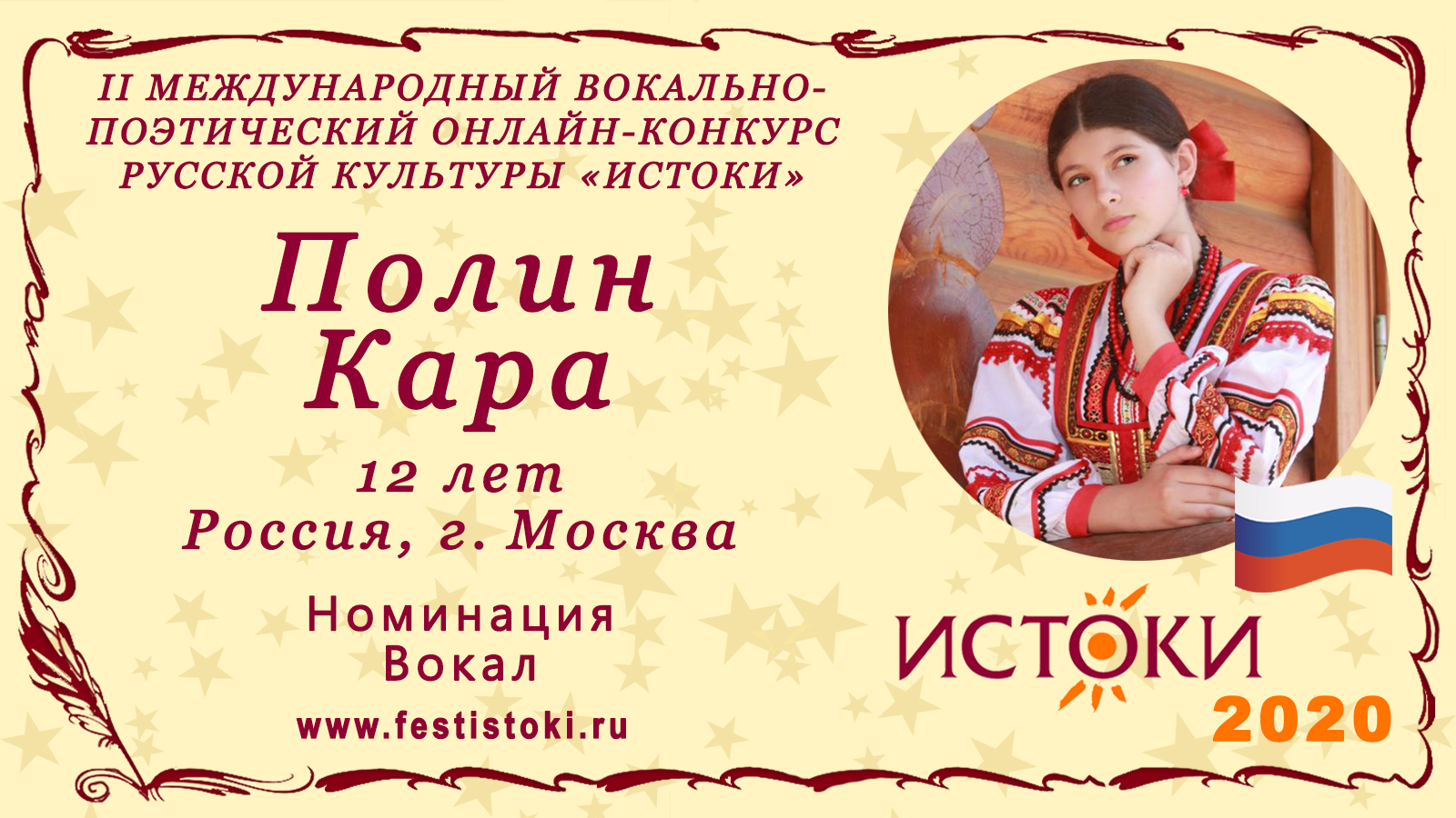 Лауреат II степени II Международного вокально-поэтического онлайн-конкурса русской культуры «Истоки». Номинация - Вокал. Народная песня "Весна красна, теплое летице" Сайт: www.festistoki.ru / www.festistoki.com E-mail: festistoki@mail.ru